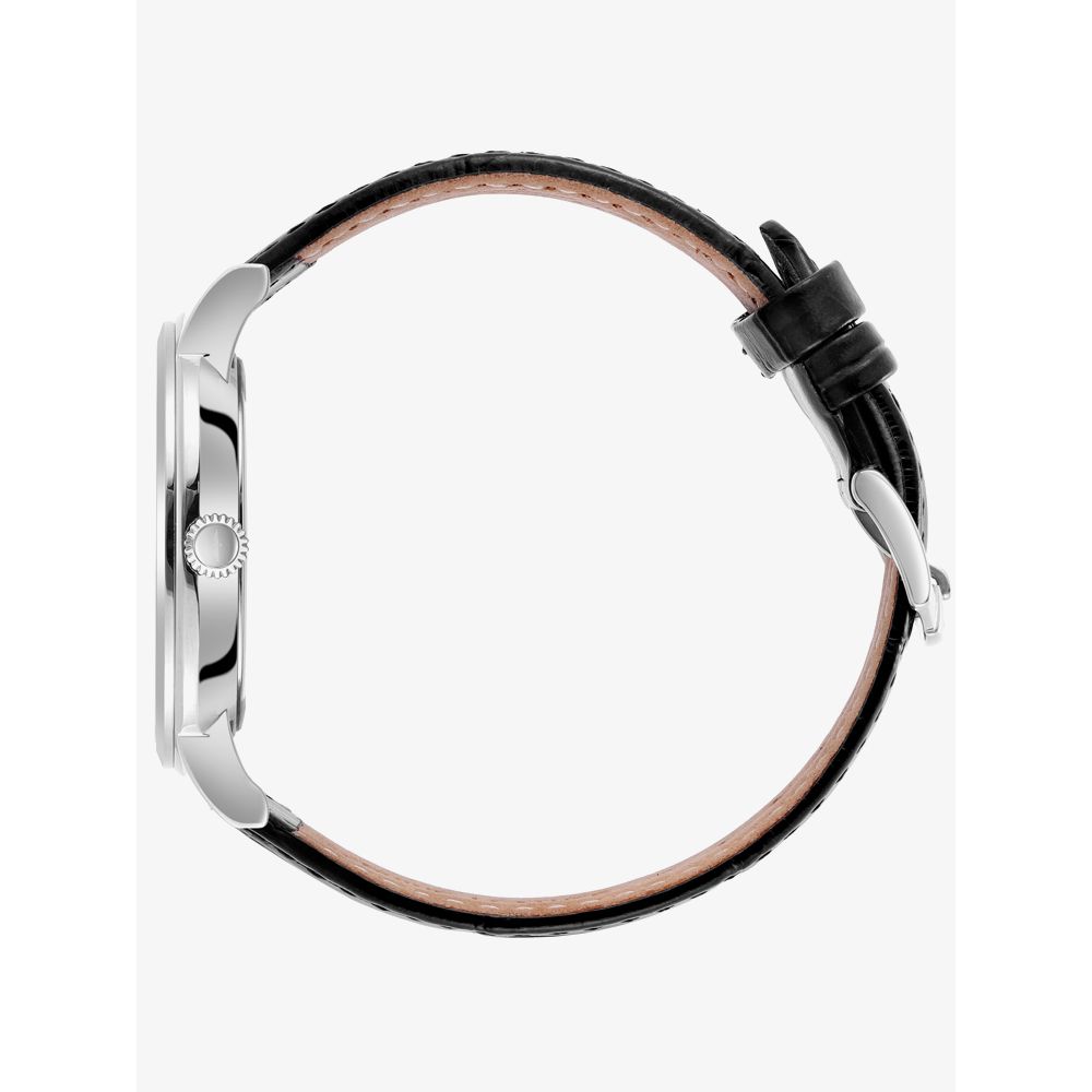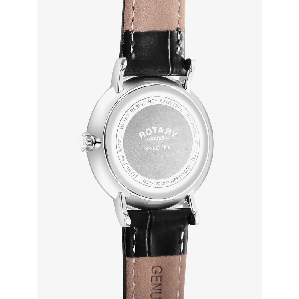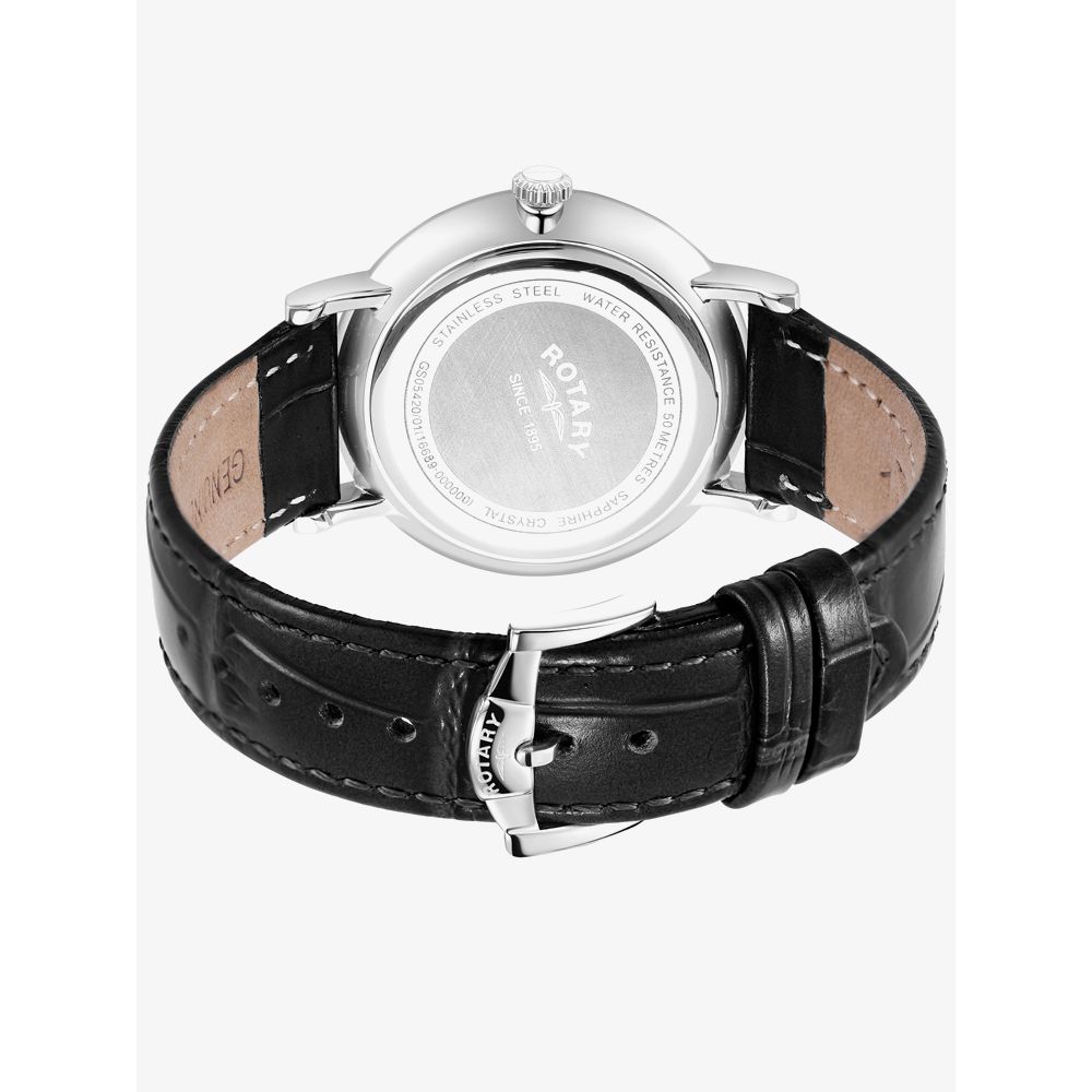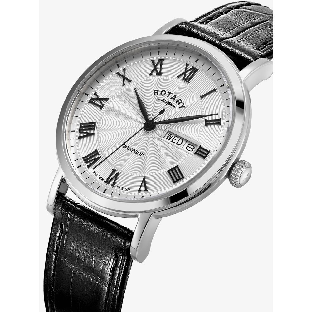 The Rotary Gents Windsor GS05420/01 watch combines a 37mm round shaped stainless steel case and black leather strap with a traditional buckle. It has a silver guilloche patterned analogue dial with day date display which are protected a beneath sapphire crystal glass. Power is generated by the quartz movement. This model also has a water resistance of up to 50 metres.