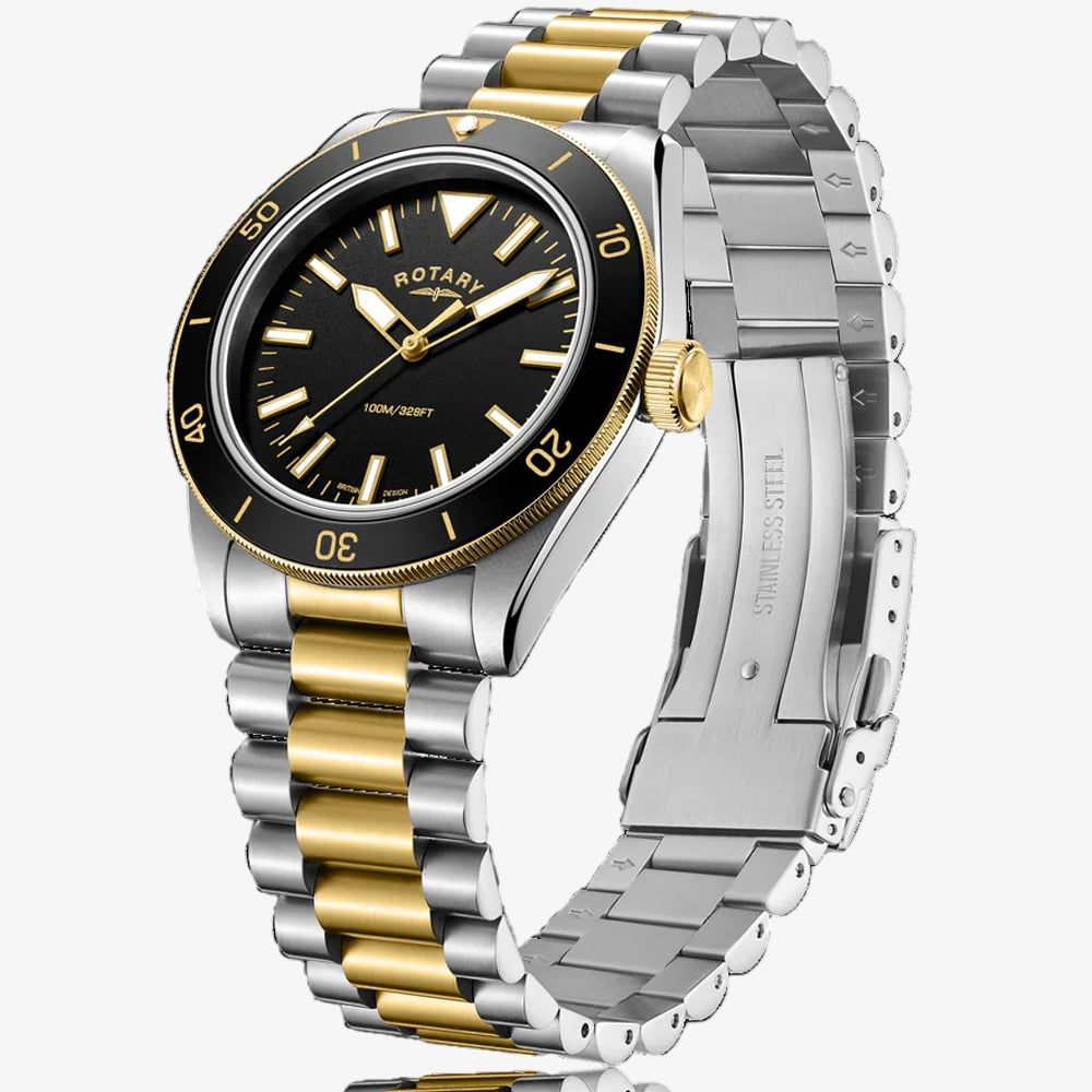 Introducing the Rotary Sport, this luxurious timepiece comes equipped with a two tone bracelet, a uni-directional bezel and lumi-nova hands for enhanced readability. Powered by a quartz three hand movement with a water resistance of 100m & a power reserve of up to 40 hours, this watch is the perfect companion for any adventurer and a versatile edition to any watch collection.