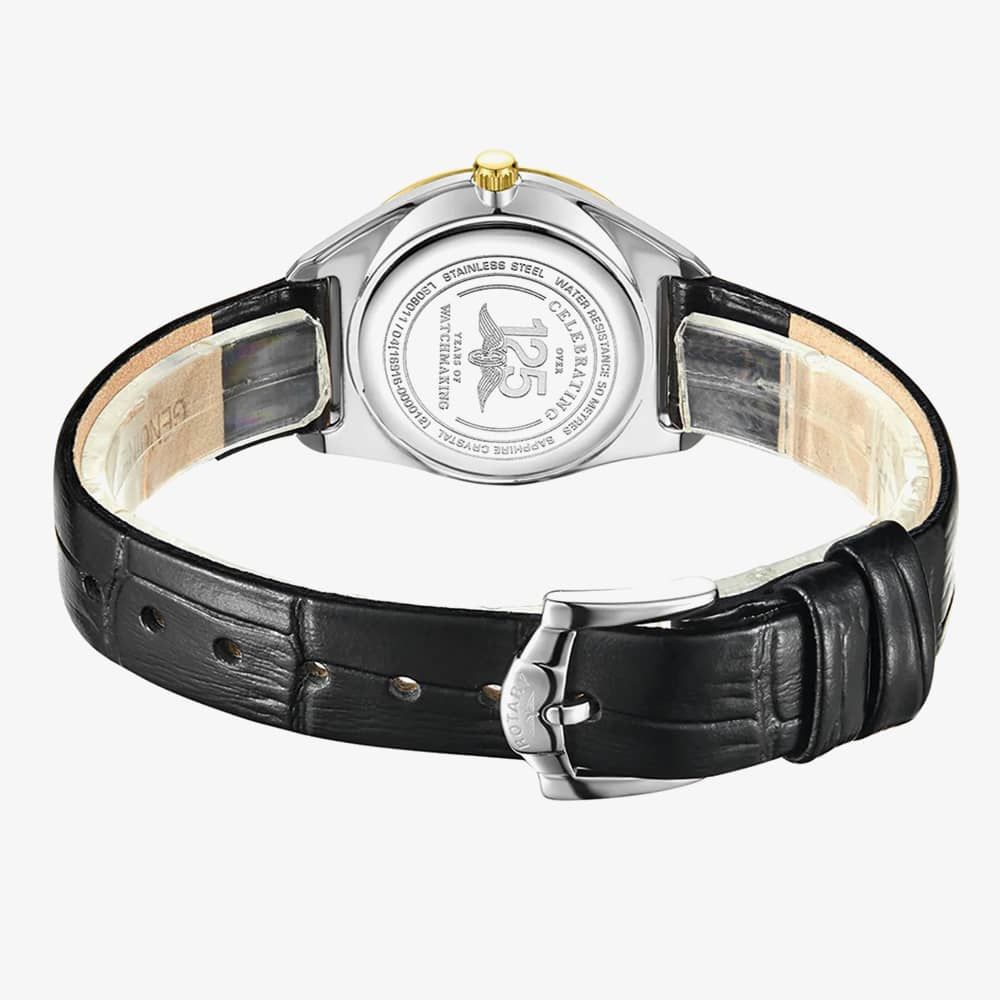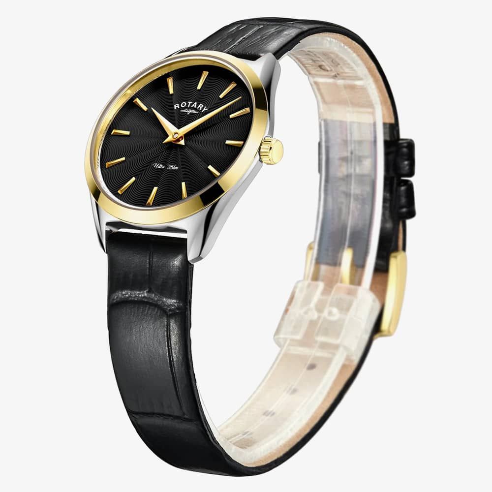 Embrace timeless elegance with the Ladies' Rotary Ultra Slim watch. Its sleek black leather strap and black dial provide a sophisticated backdrop for the striking gold dial batons and hands. This watch is a perfect blend of classic and modern design, adding a touch of luxury to any outfit.