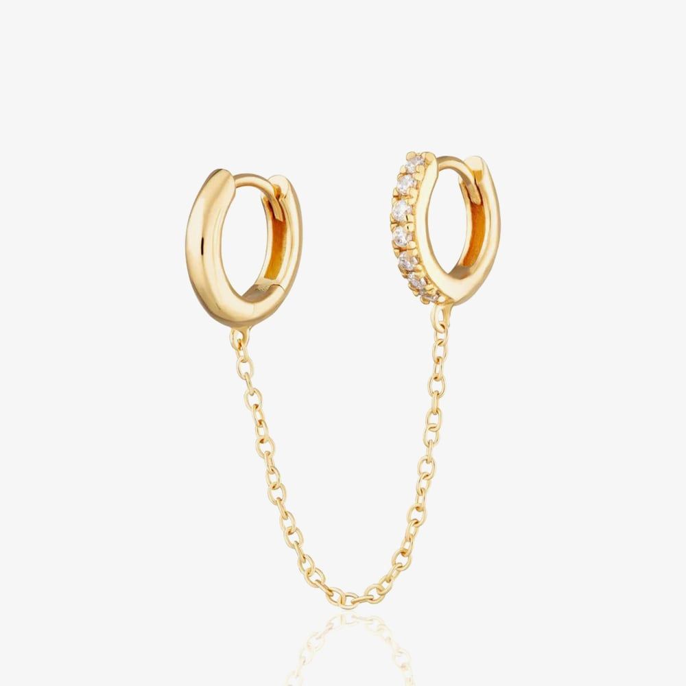 This chain-linked mismatched huggie hoop earring combines a polished hoop with a sparkling one paved with white nano cubic zirconia. Connected by a chain, it’s perfect for two piercings in one ear, wearable in the lobe or cartilage. Crafted from 18ct gold-plated silver for added shine.