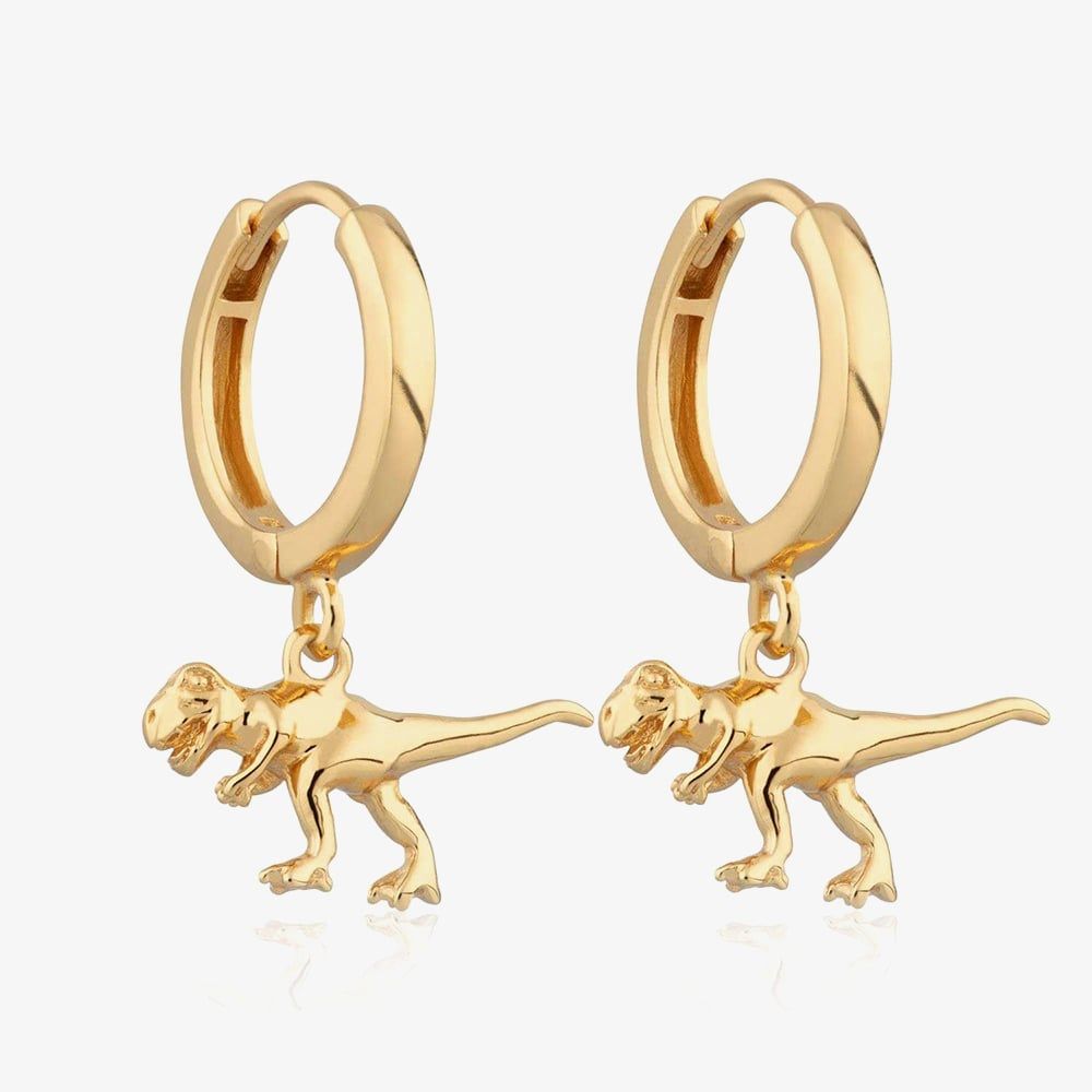 Embrace the dinosaur trend with these 18ct gold-plated sterling silver T-Rex hoop earrings. Featuring intricately detailed dinosaur charm droppers, these quirky and playful earrings add a bold touch to any look. A fun statement piece that’s sure to turn heads, they’re perfect for dino lovers and trendsetters alike!