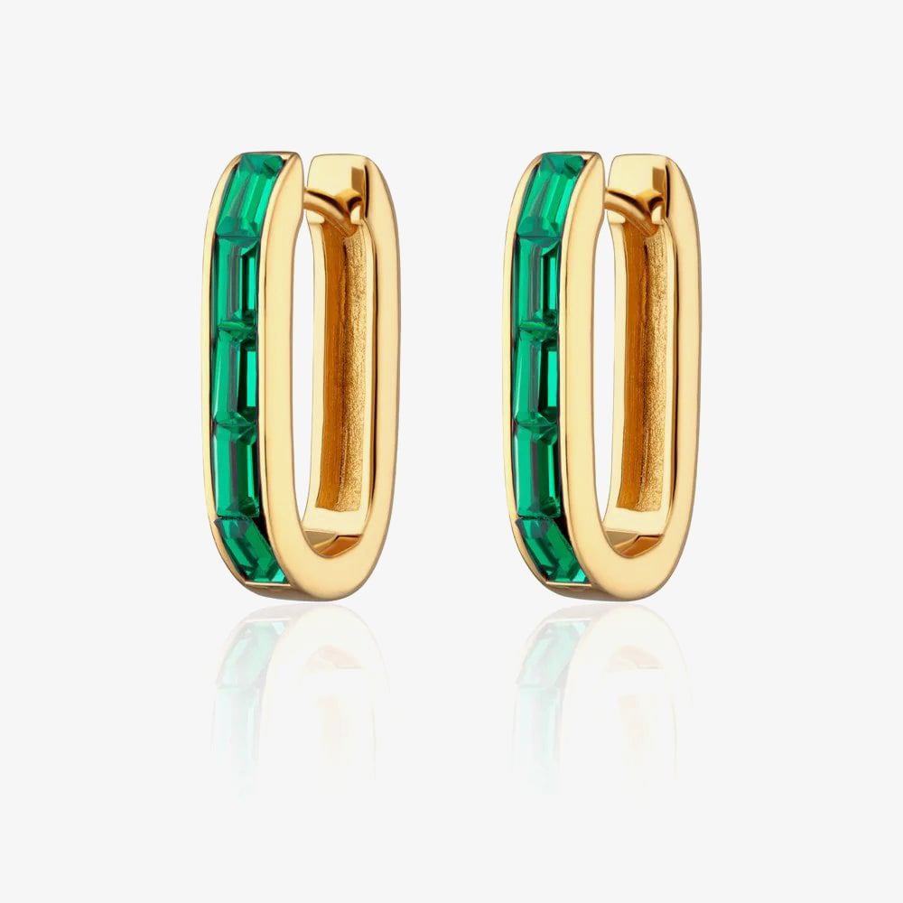 Step into the green stone trend with the 18ct Gold Plated Oval Green Cubic Zirconia Hoop Earrings. Crafted from sterling silver and finished with luxe 18ct gold plating, these bold, elongated hoops are set with five baguette-cut emerald green cubic zirconia stones for vibrant color and eye-catching sparkle. Featuring a hinged clasp for easy wear, they’re your green light to effortless, standout styling.