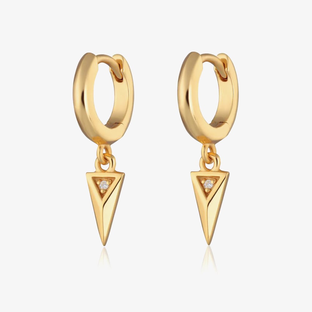 Embrace the bold charm of these Rebel Charm Hoop Earrings. Made from rhodium-plated sterling silver or 18ct gold-plated silver, these earrings feature a faceted triangular charm set with a white cubic zirconia stone, hanging from a sleek hoop. With a rebellious take on art deco style, these triangle charm hoops add a bold attitude to your everyday look.