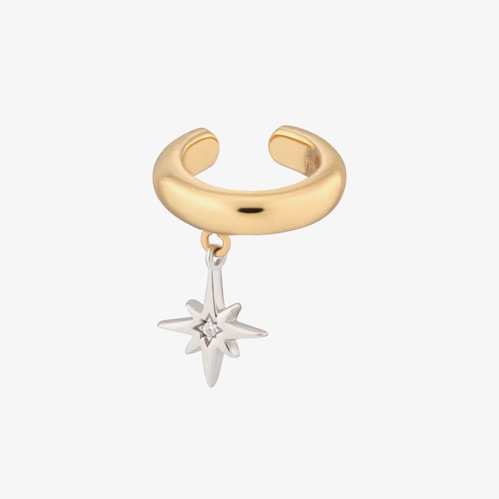 This striking mixed metal starburst drop single ear cuff is the perfect accessory to elevate any look with sophistication and bold flair. Crafted from high-quality sterling silver, it features a stunning combination of rhodium and 18ct gold plating, adding depth and luxury. The standout design includes a star-shaped drop, delicately studded with a single white cubic zirconia stone that sparkles with every movement.