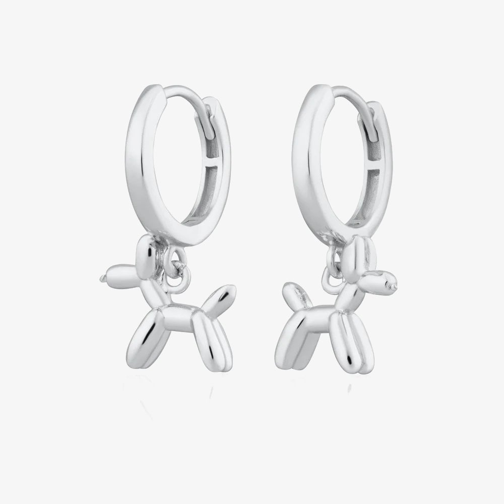 Add a playful touch to your jewellery collection with these rhodium-plated sterling silver hoop earrings featuring a cute balloon dog charm dropper. Inspired by iconic balloon animals, these fun and quirky earrings are a bold statement piece. Crafted with precision, the polished hoops and detailed dog charm offer a delightful, durable design that catches the eye and adds a unique flair to any outfit.