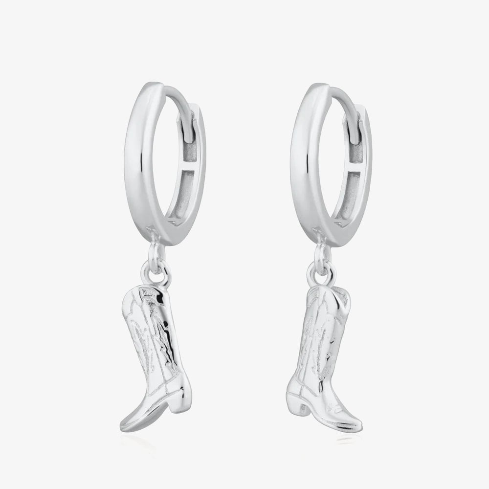 Add some western flair to your look with these rhodium-plated sterling silver hoop earrings, featuring intricately crafted cowboy boot charm droppers. The detailed cowboy boot charms dangle from the polished hoops, creating a fun, dynamic movement that adds extra dimension to your style. A perfect statement piece for anyone who loves bold, unique accessories.