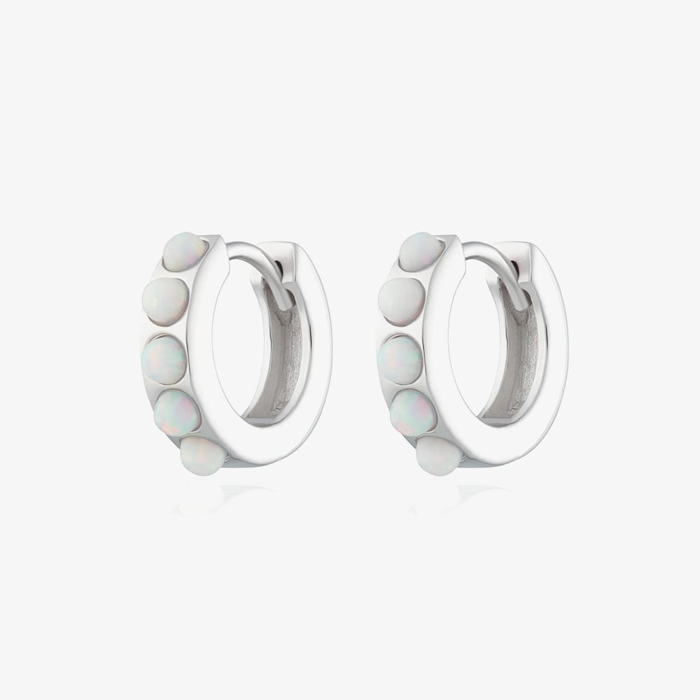 Elevate your style with these Rhodium plated sterling silver huggie earrings, adorned with vibrant white opal stones. A modern classic with a touch of sparkle, these sleek hoops add a fresh, stylish finish to any look. Perfect for everyday wear, they’re comfortable enough to sleep in and versatile enough for cartilage piercings.