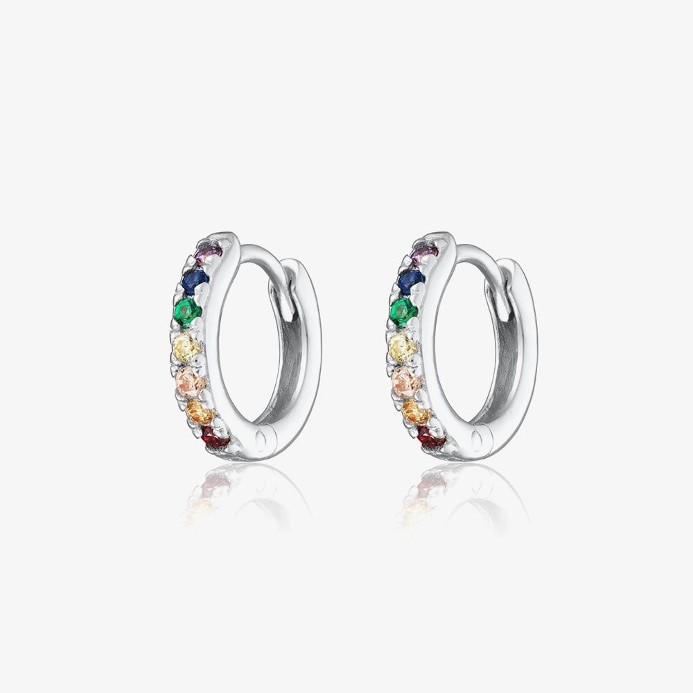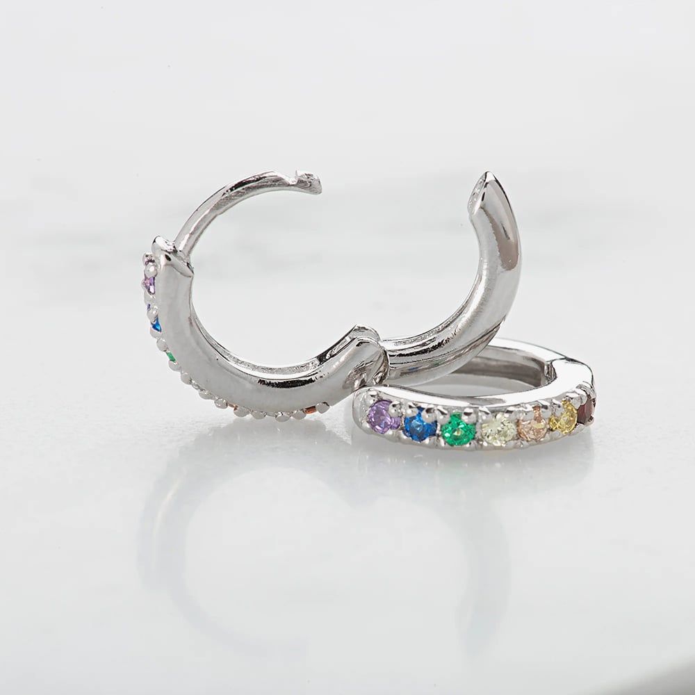 The Sterling Silver Rhodium Rainbow Cubic Zirconia Huggie Hoop Earrings bring a dazzling shimmer to a classic design. Adorned with vibrant stones on the front, these sleek huggie hoops add a touch of sparkle to any look. Comfortable for everyday wear, they’re a stylish and effortless way to elevate your ear stack.