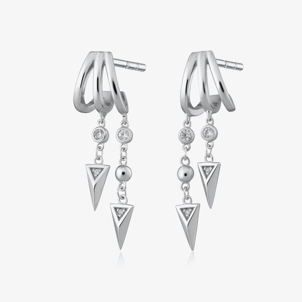 For a bold triple earring look, try these Rebel Illusion Hoop Earrings. Featuring three hoops that hug the ear in one design, they include a sleek rebel chain drop for added movement and sparkle. Lightweight and comfortable, these earrings make a dramatic statement and are perfect for everyday wear. Wear them alone for impact or layer them for a standout ear stack. Crafted from rhodium-plated silver.