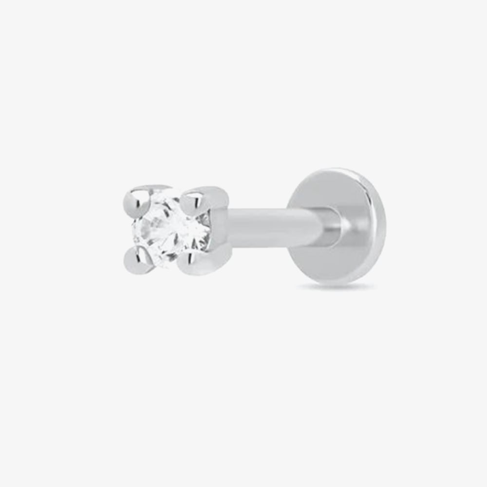 Elevate your ear stack with this white cubic zirconia stud earring. Designed for comfort, it features a smooth flat disc back for a secure fit without the pressure of traditional butterfly clasps. Perfect for all-day wear, even while sleeping. Made from rhodium-plated silver.