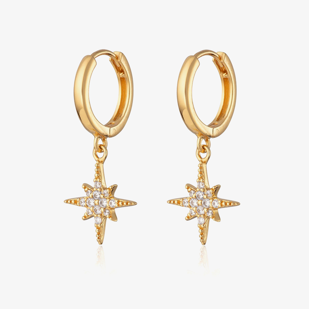 Add a celestial sparkle to your look with the Starburst 18ct gold plated silver Cubic Zirconia Star Charm Hoop Earrings. Featuring dazzling star-shaped charms encrusted with cubic zirconia, these gold-plated hoops bring a touch of glamour and elegance to any outfit—perfect for day-to-night shine.