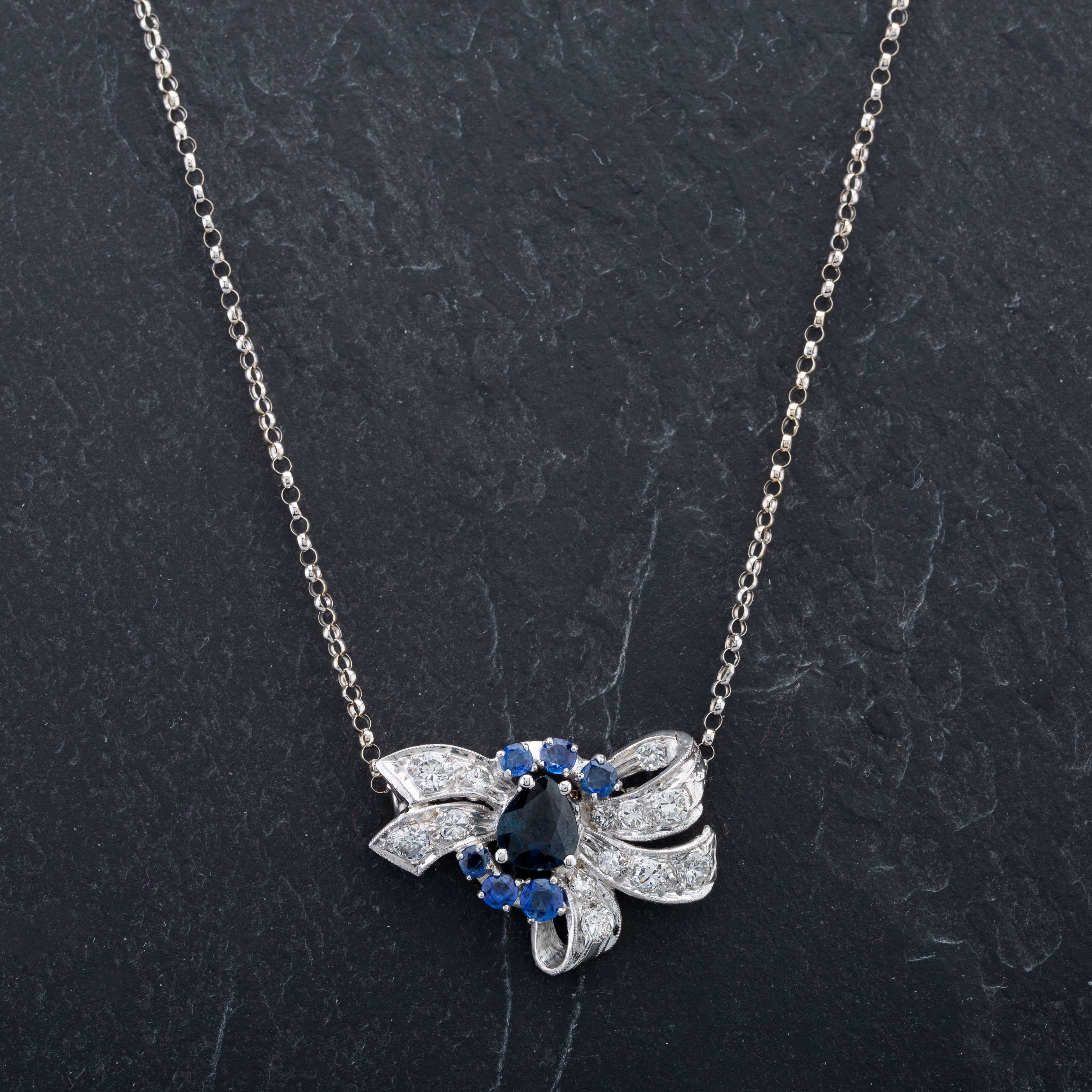 14ct White Gold Beautiful Sapphire and Diamond Set Spray Pendant with 14" Round Belcher Link Necklace 13 Brilliant Cut Graduated Diamonds Approximate Weight 0.70ct with Centre Pear Cut Sapphire and 6 Round Cut Sapphires Approximate Weight 2.09ct