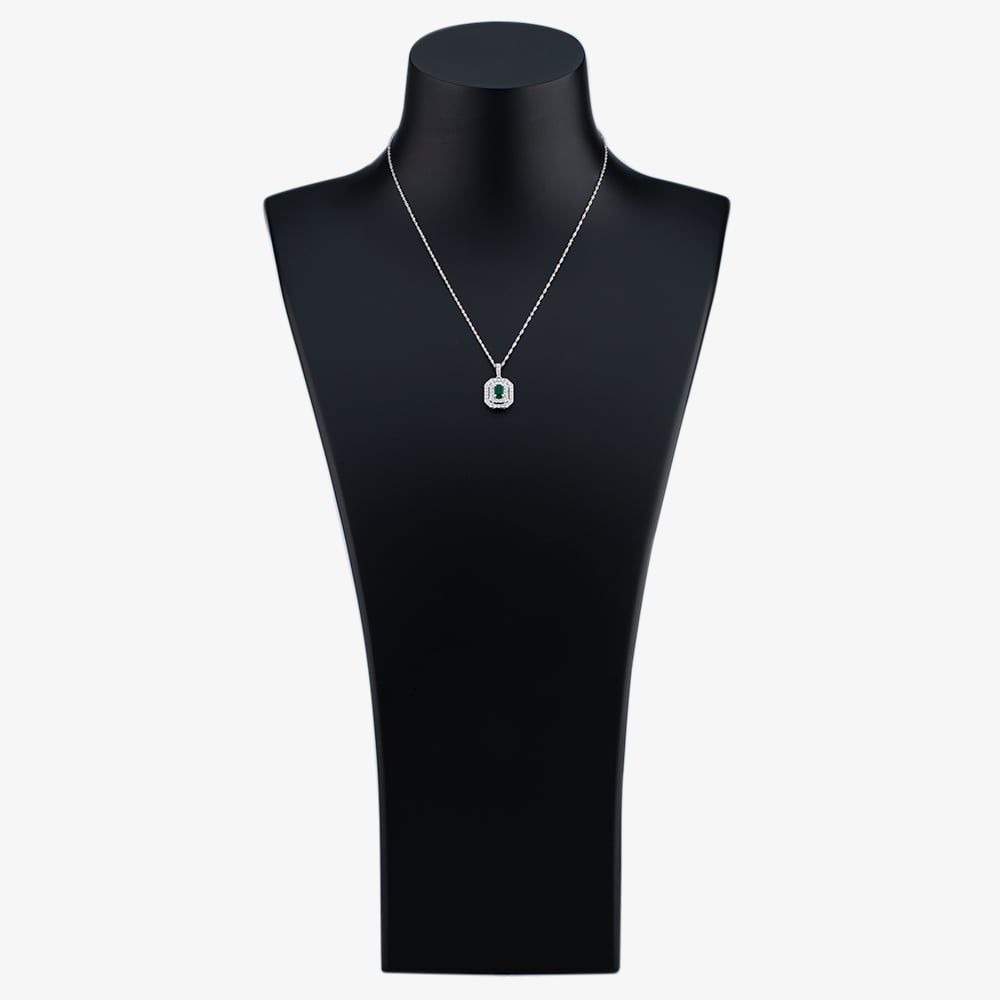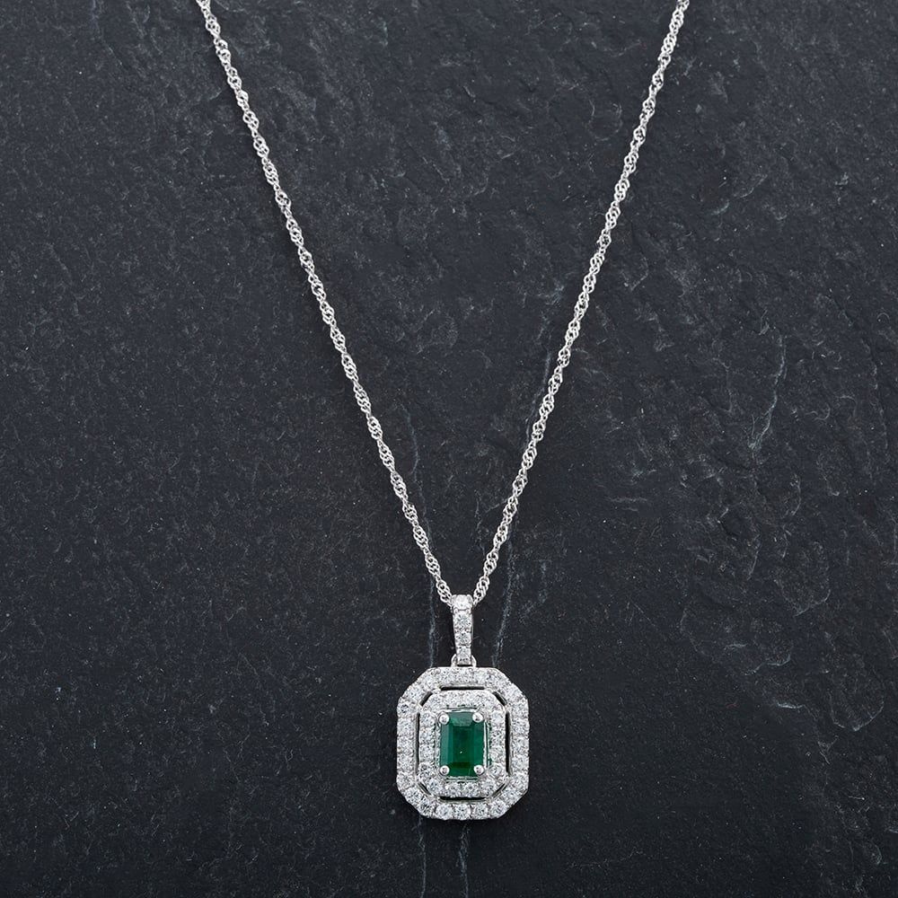 14ct White Gold Diamond and Emerald Cut Emerald 3 Tier Cluster Pendant On 16" Prince Of Wales Link Necklace Approximate Diamond Weight Total 0.65ct Emerald Approximate Weight 0.60ct