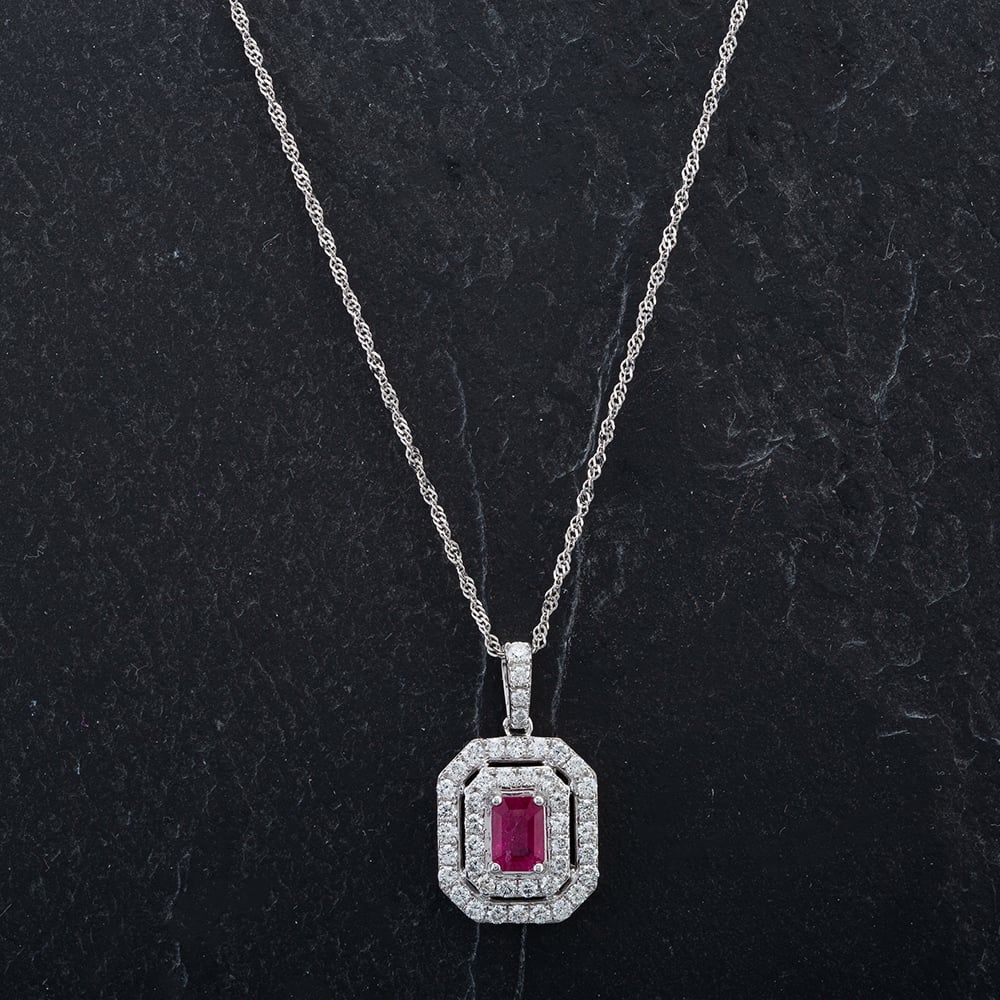 14ct White Gold Emerald Cut Ruby with Brilliant Cut Diamonds On 16" Prince Of Wales Necklace Approximate Diamond Weight 0.67ct Ruby Weight Approximate 0.56ct