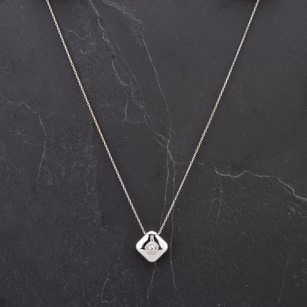 14ct White Gold Square Polished Pendant with Brilliant Cut Diamond Cluster Centre On 16 Inch Trace Link Necklace Diamond Weight 0.27ct