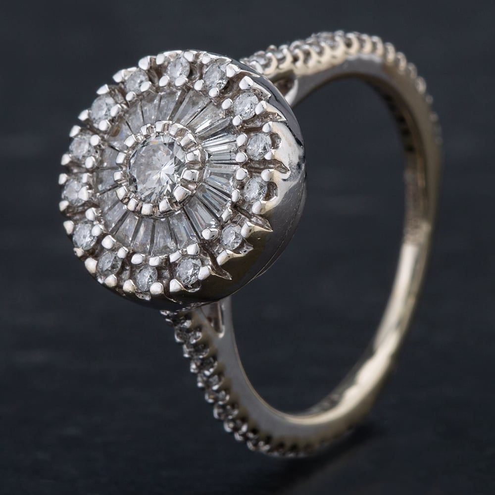 14ct White Gold Brilliant and Baguette Cut Diamond Cluster Ring with Diamond Set Half Shank Approximate Total Diamond Weight 1.00ct