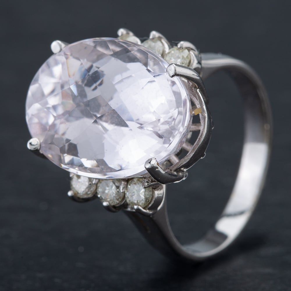 14ct White Gold Large Oval Kunzite Gemstone Measuring Approximately 15.7Mm By 11.9Mm With Three Brilliant Cut Diamonds On Each Shoulder Approximate Total Diamond Weight 0.50ct Approximate Kunzite Weight 12.00ct