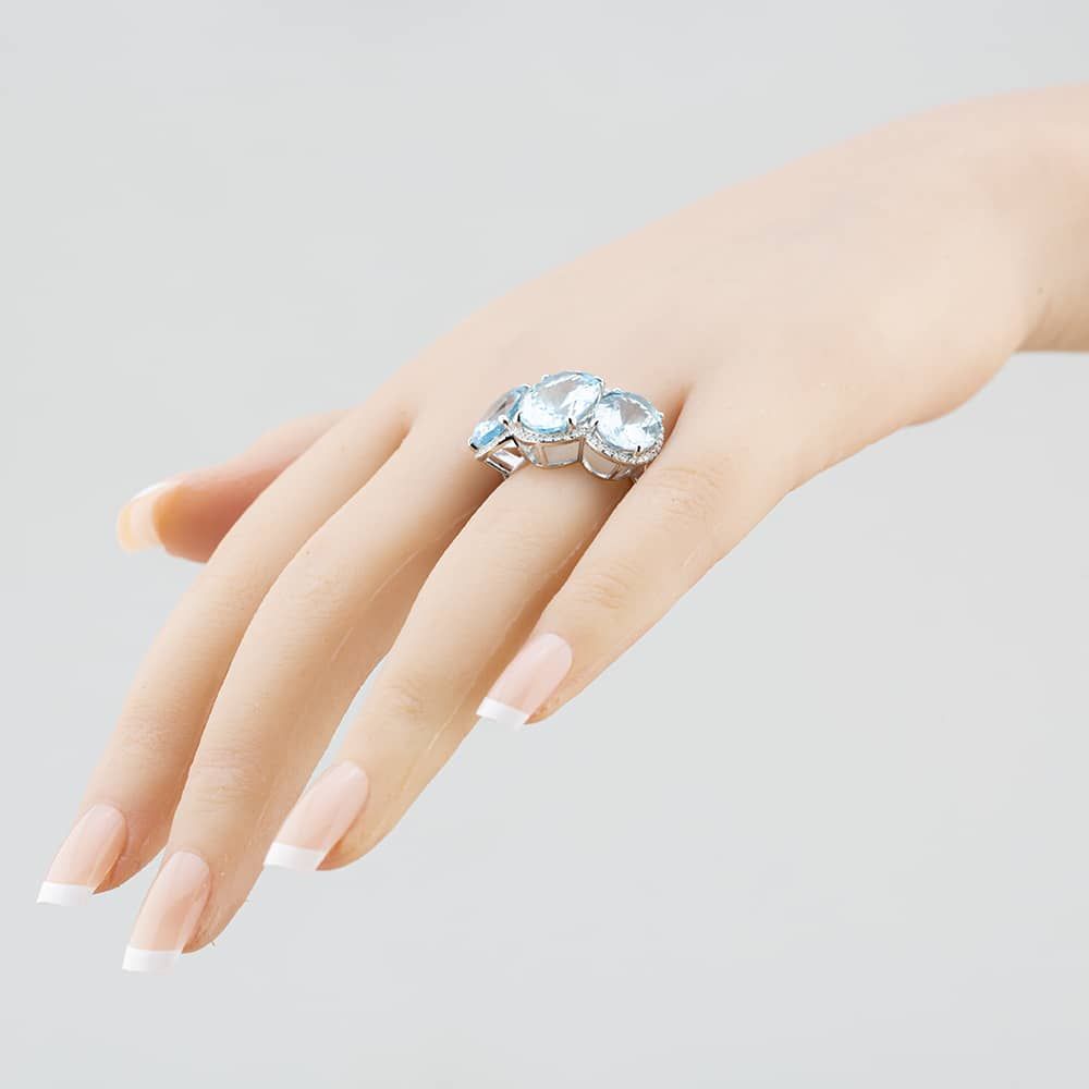 14ct White Gold Oval Cut Aquamarine & Brilliant Cut Diamond Triple Cluster Ring