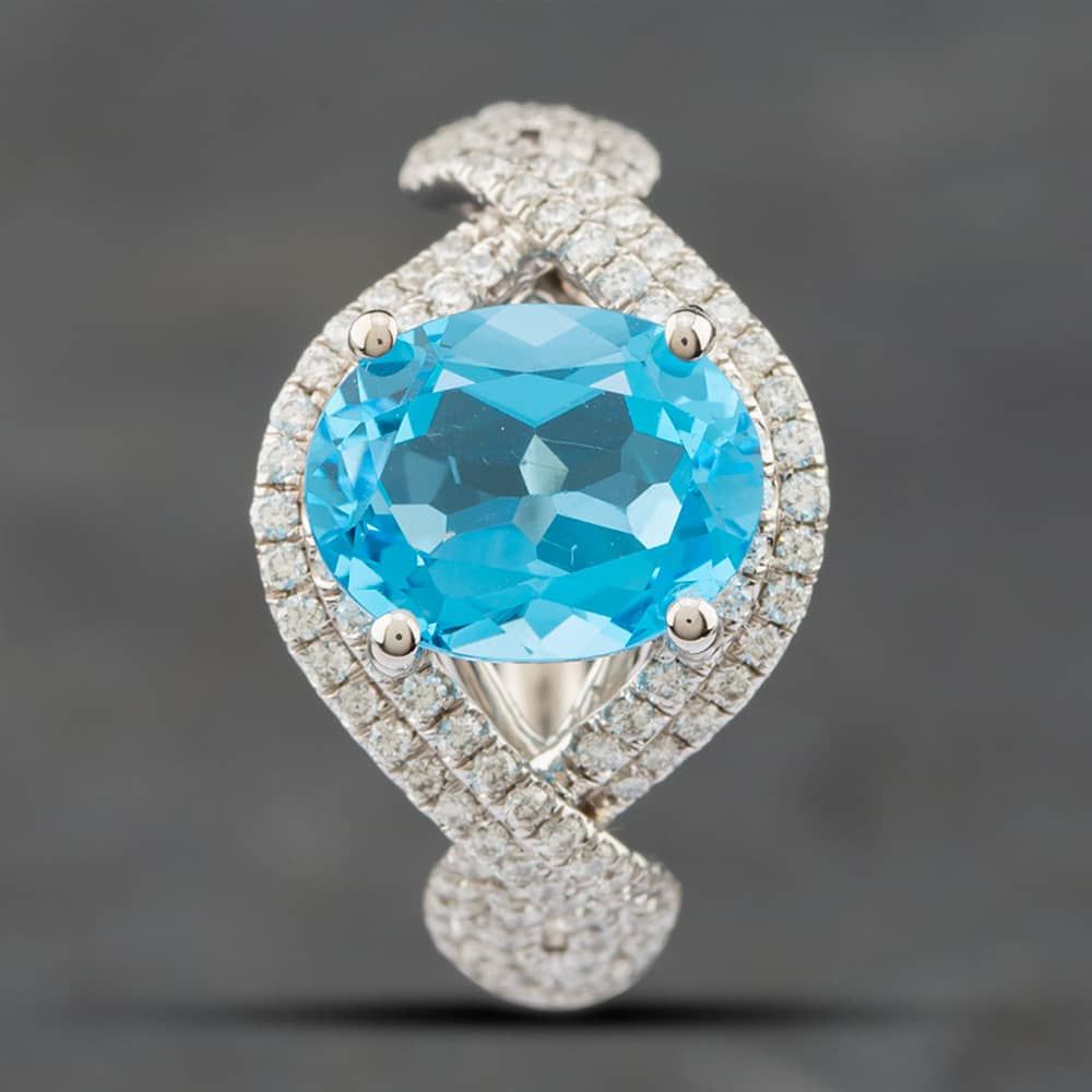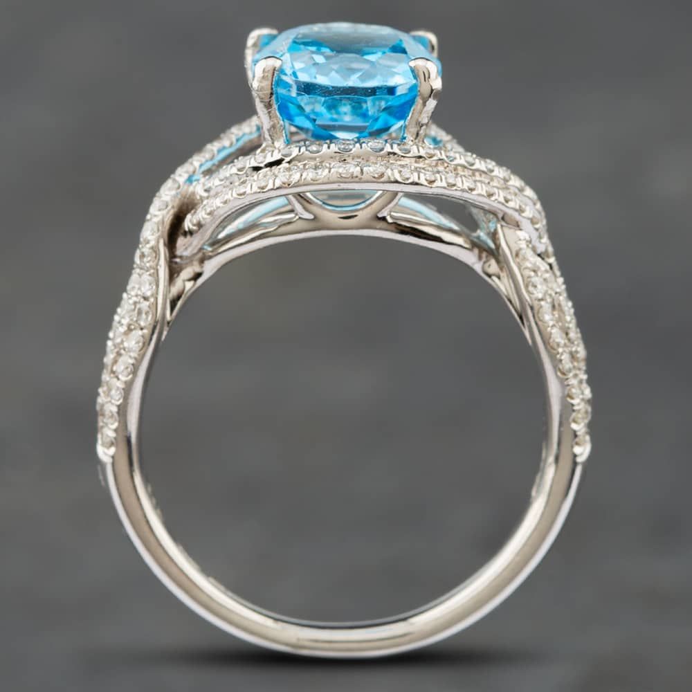 14ct White Gold Oval Cut Blue Topaz & Single Cut Diamond Crossover Ring