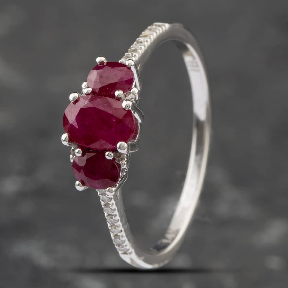 14ct White Gold Oval Cut Ruby & Diamond Set Shoulders three Stone Ring