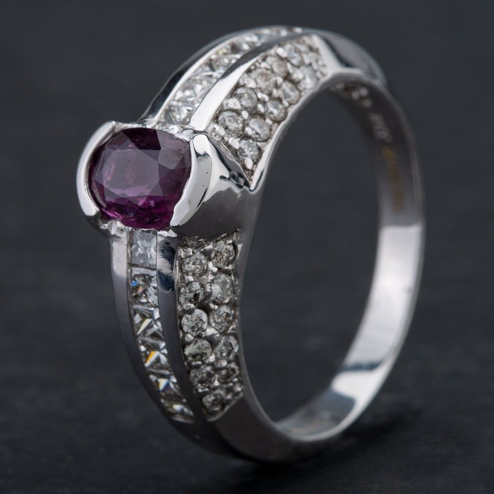 14ct White Gold Oval Ruby with Pave Set Brilliant Cut and Baguette Cut Diamond Shoulders Approximate Total Diamond Weight 1.40ct Ruby Approximate Weight 1.00ct
