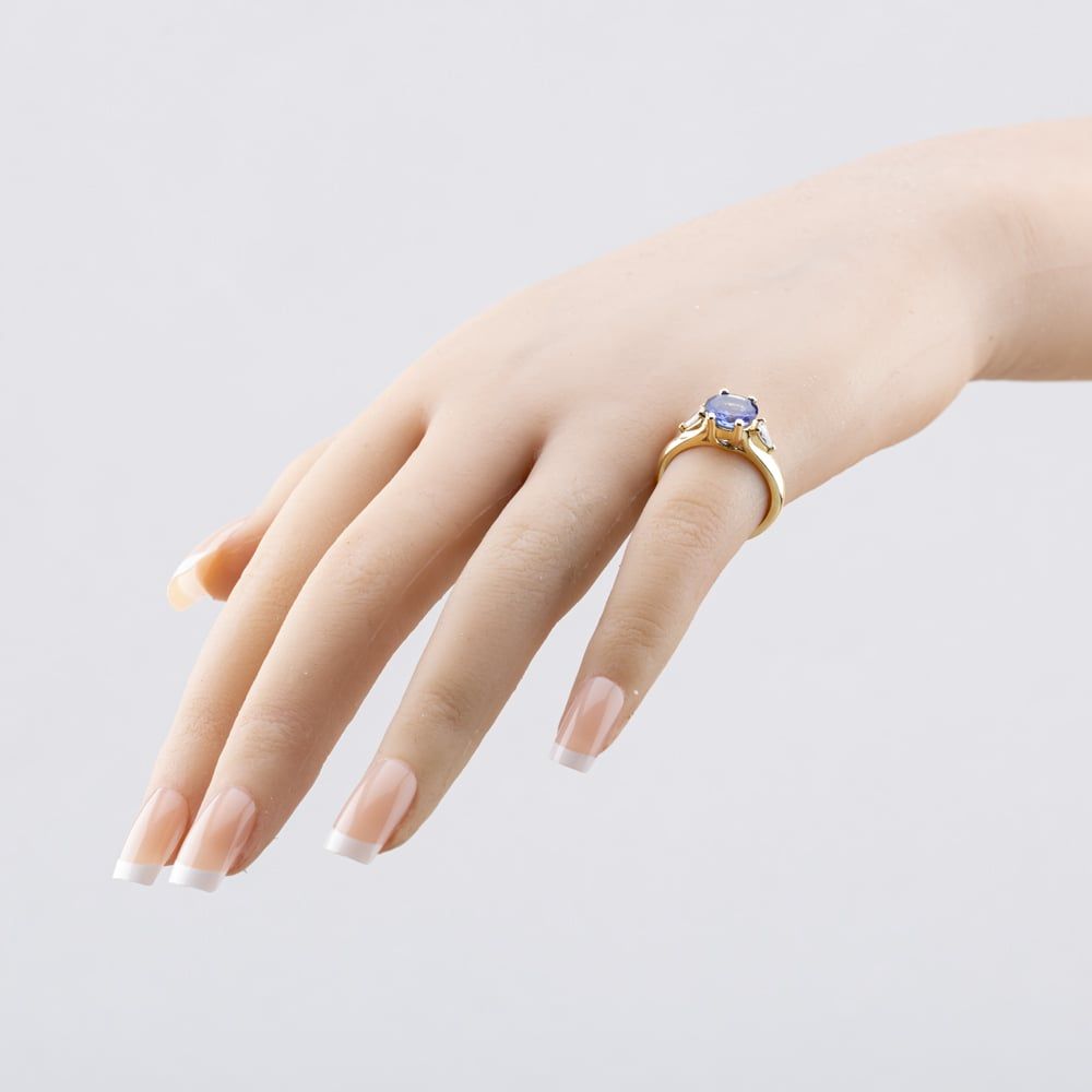 14ct Yellow Gold Tanzanite & 0.25ct Pear Cut Diamond three Stone Ring
