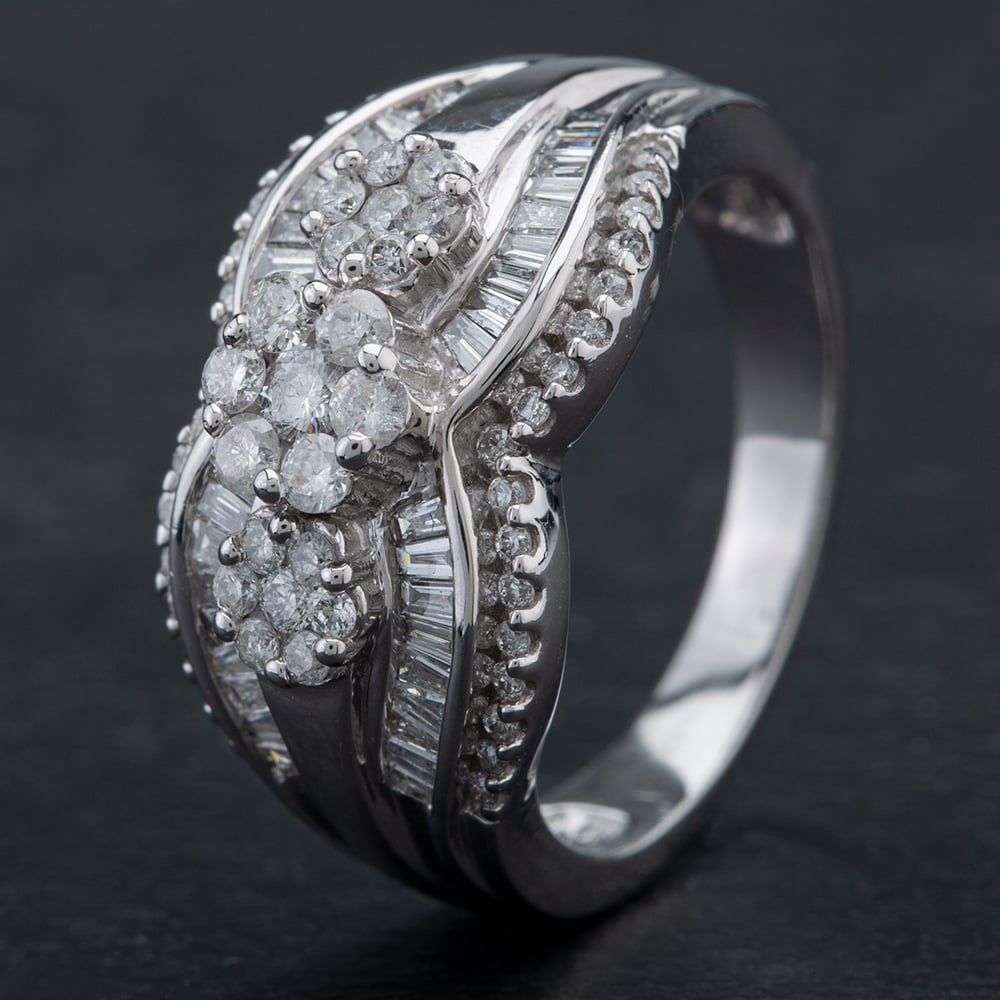 14ct White Gold Stunning Flower Trilliant Cut Diamond Triple Cluster Surrounded By Baguette and Brilliant Cut Diamonds Total Diamond Weight 1.00ct