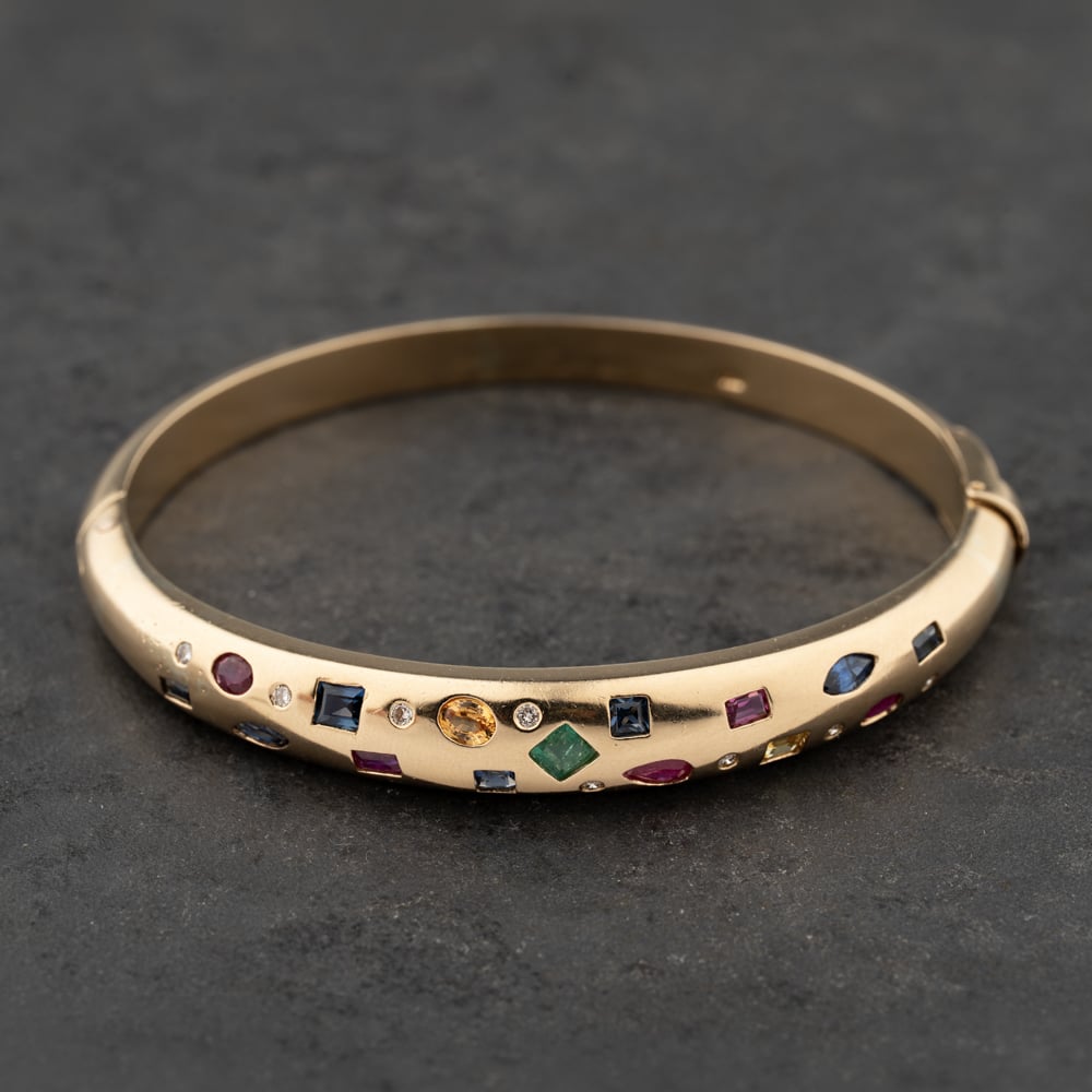 <a href="https://www.thbaker.co.uk/stores/"><b>Click here to find your <font color="6d1a42">nearest store</font></b></a>Second Handhttps://www.thbaker.co.uk/media/catalog/product/4/1/41-21-1372_model_1.jpgadd-to-cartcondition:Yesdisc_no_stock:NoYesNo41211372Second Hand41211372LadiesT H Baker Packaging12 Month WarrantyNoBangle28.3gStandardHinged14ct Yellow GoldMulti-ColouredMulti StoneMulti-Coloured0.16ct{"name":"v12_finance","text":"Or from \u00a370 per month","imageUrl":"https:\/\/www.thbaker.co.uk\/media\/nosto\/v12-finance.png"}Second Hand 14ct Yellow Gold 0.16ct Multi Stone Hinged Bangle41-21-13722025-12-19 00:00:00[{"path":"\/Jewellery","url":"\/jewellery\/"},{"path":"\/Second Hand Collection","url":"\/second-hand\/"},{"path":"\/Second Hand Collection\/Second Hand Jewellery","url":"\/second-hand-jewellery\/"},{"path":"\/Second Hand Collection\/Second Hand Bracelets & Bangles","url":"\/second-hand-bracelets-and-bangles\/"},{"path":"\/Jewellery\/Gold Jewellery","url":"\/gold-jewellery\/"},{"path":"\/Second Hand Collection\/Second Hand Jewellery\/Second Hand Yellow Gold","url":"\/second-hand-yellow-gold-jewellery\/"},{"path":"\/Second Hand Collection\/Second Hand Ladies","url":"\/second-hand-ladies-collection\/"},{"path":"\/Second Hand Collection\/Second Hand Gemstones","url":"\/second-hand-gemstone-jewellery\/"},{"path":"\/Jewellery\/Ladies Jewellery","url":"\/ladies-jewellery\/"},{"path":"\/Second Hand Collection\/Second Hand Bracelets & Bangles\/Second Hand Bangles","url":"\/second-hand-bangles\/"},{"path":"\/Jewellery\/Gold Jewellery\/Yellow Gold Bangles","url":"\/yellow-gold-bangles\/"},{"path":"\/Free Gift Card - When you spend \u00a3500+","url":"\/free-gift-card\/"},{"path":"\/Second Hand Collection\/Second Hand Gold","url":"\/second-hand-gold\/"},{"path":"\/Spend over \u00a31000 and receive a \u00a3100 gift card","url":"\/gift-card-promotion\/"},{"path":"\/\u00a3300 Gold Gift Card (\u00a33001 - \u00a34000)","url":"\/300-gold-gift-card\/"},{"path":"\/Second Hand Collection\/Second Hand Jewellery\/Second Hand 14ct","url":"\/second-hand-14ct-jewellery\/"},{"path":"\/Second Hand Collection\/Second Hand Latest Additions","url":"\/second-hand-latest-additions\/"},{"path":"\/Second Hand Collection\/Second Hand Bracelets & Bangles\/Second Hand Yellow Gold Bracelets","url":"\/second-hand-yellow-gold-bracelets\/"},{"path":"\/Second Hand Collection\/Second Hand Bracelets & Bangles\/Second Hand Ladies Bracelets","url":"\/second-hand-ladies-bracelets\/"},{"path":"\/Free Gift With Purchase Products","url":"\/free-gift-with-purchase-products\/"}]2025-12-19