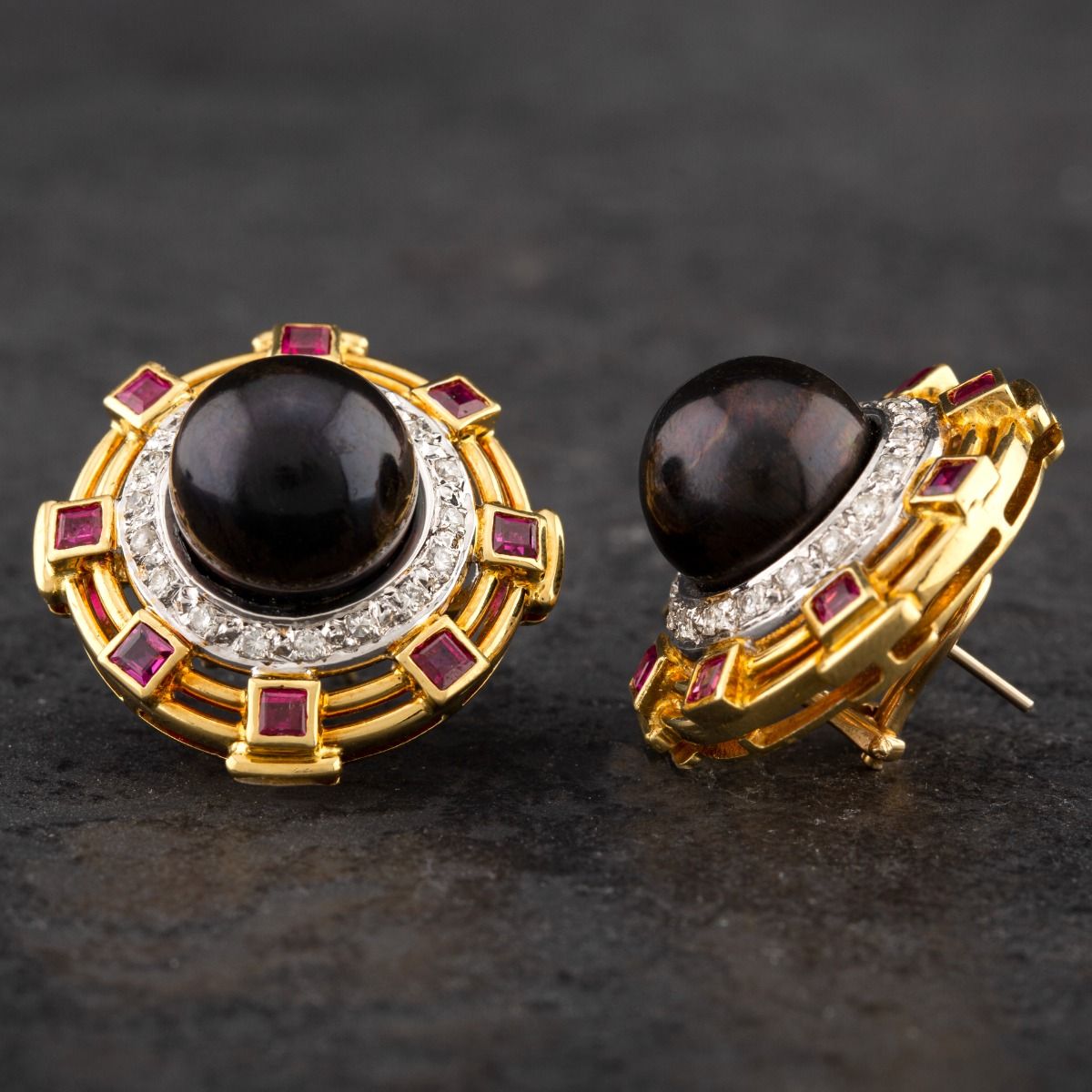 14ct Yellow Gold 1.50ct Ruby & 0.75ct Brilliant Cut Diamond And Black South Sea Pearl Large Fancy Stud Earrings