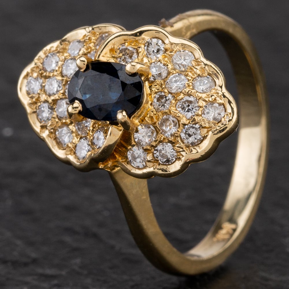 14ct Yellow Gold Claw Set Oval Sapphire Centre Stone Surrounded By Pave Set Brilliant Cut Diamonds In A Fancy Marquise Shape Cluster Ring. All Diamonds Are Natural Tested Stones