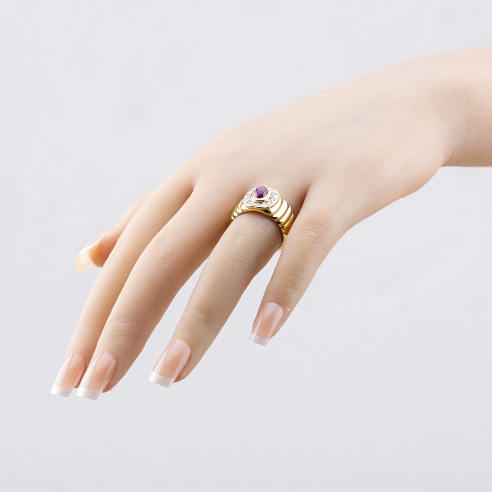 Second Hand 14ct Yellow Gold Ruby & 0.36ct Brilliant Cut Diamond Tiered Shoulders Cluster Ring 41481755 Second Hand 14ct Yellow Gold Ruby & 0.36ct Brilliant Cut Diamond Tiered Shoulders Cluster Ring 41481755