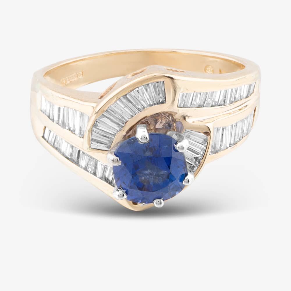 14ct Yellow Gold Sapphire & 0.80ct Baguette Cut Diamond Two Row Twist Dress Ring