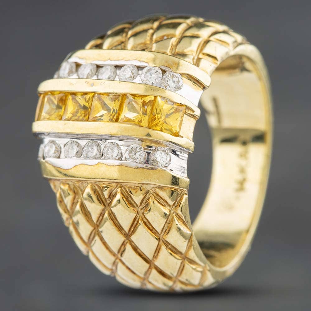 14ct Yellow Gold Yellow Sapphire & 0.30ct Brilliant Cut Diamond Three Row Dress Ring