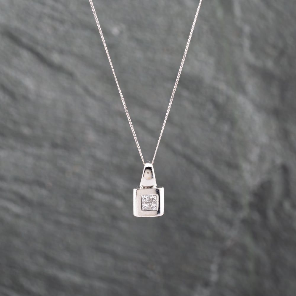 18ct White Gold 0.25ct Princess Cut Diamond Square Four Stone Pendant & 18 Inch Curb Chain