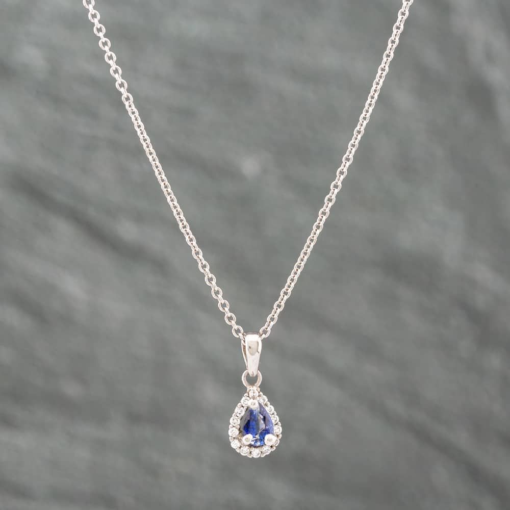 18ct White Gold 0.33ct Pear Cut Sapphire & Diamond Cluster Pendant & 18 Inch Trace Chain