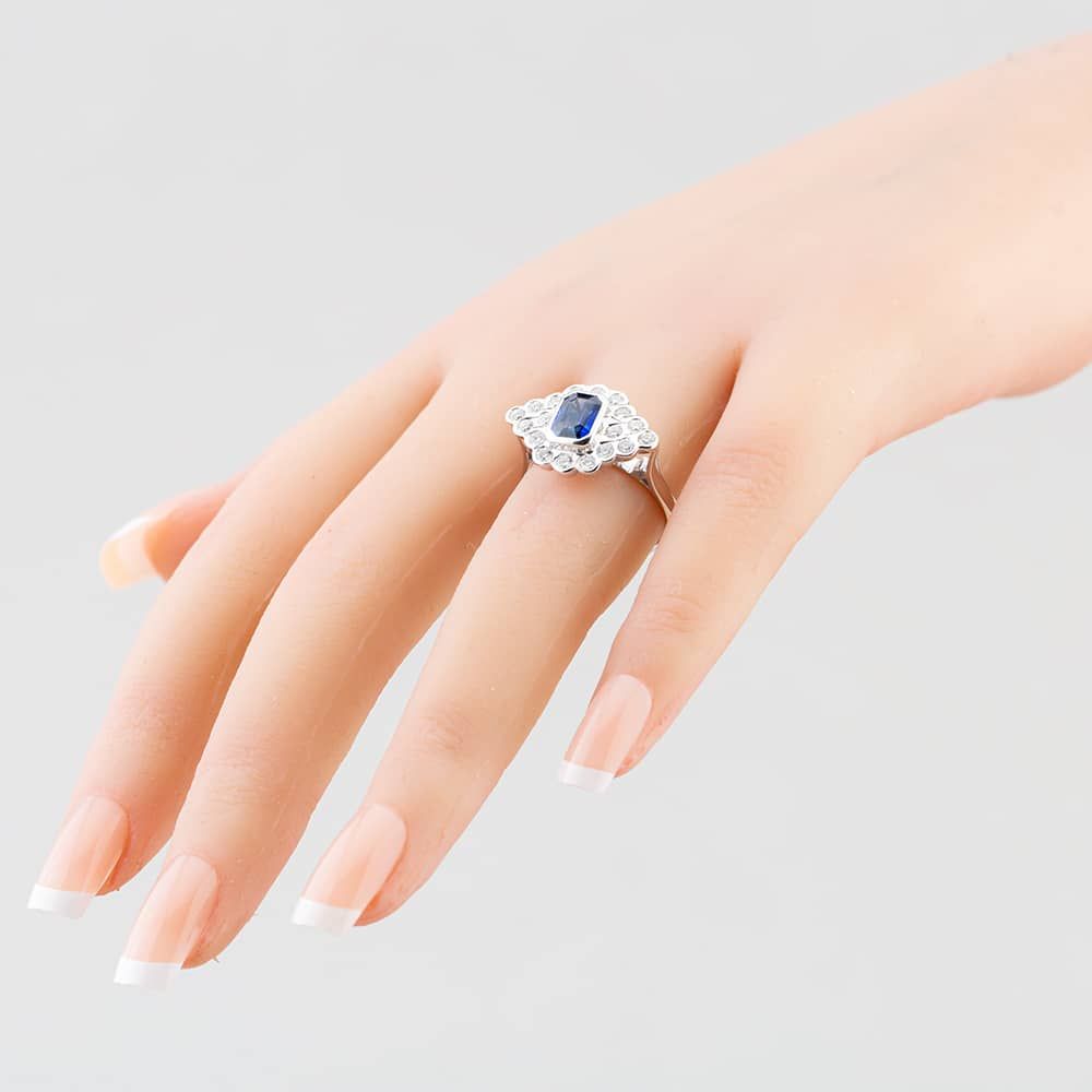 18ct White Gold 1.11ct Emerald Cut Sapphire & 0.61ct Brilliant Cut Diamond Cluster Ring