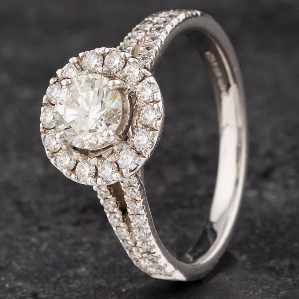 18ct White Gold Round Brilliant Cut Diamond Halo Cluster Ring With Diamond Report Centre Diamond Weight 0.59ct Outer Diamonds Weight 0.50ct Clarity Si1 Colour J