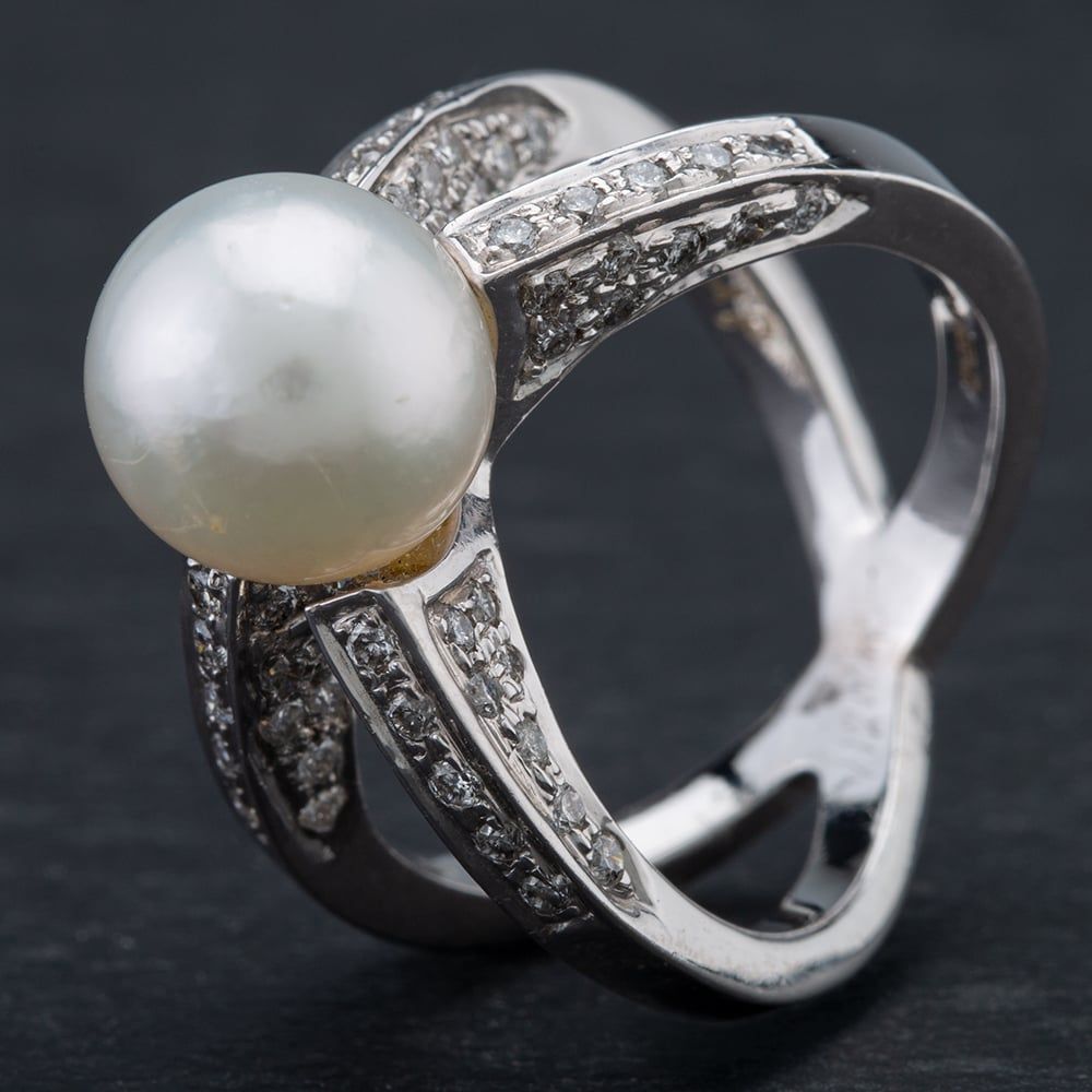 18ct White Gold High Set 10mm Cultured Pearl with 4 Pave Diamond Shoulders Cross Over Design dress Ring