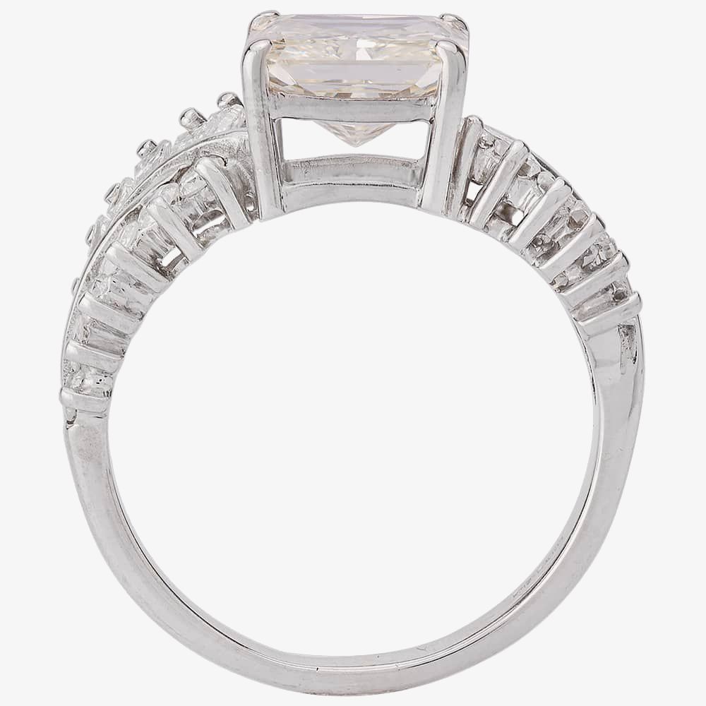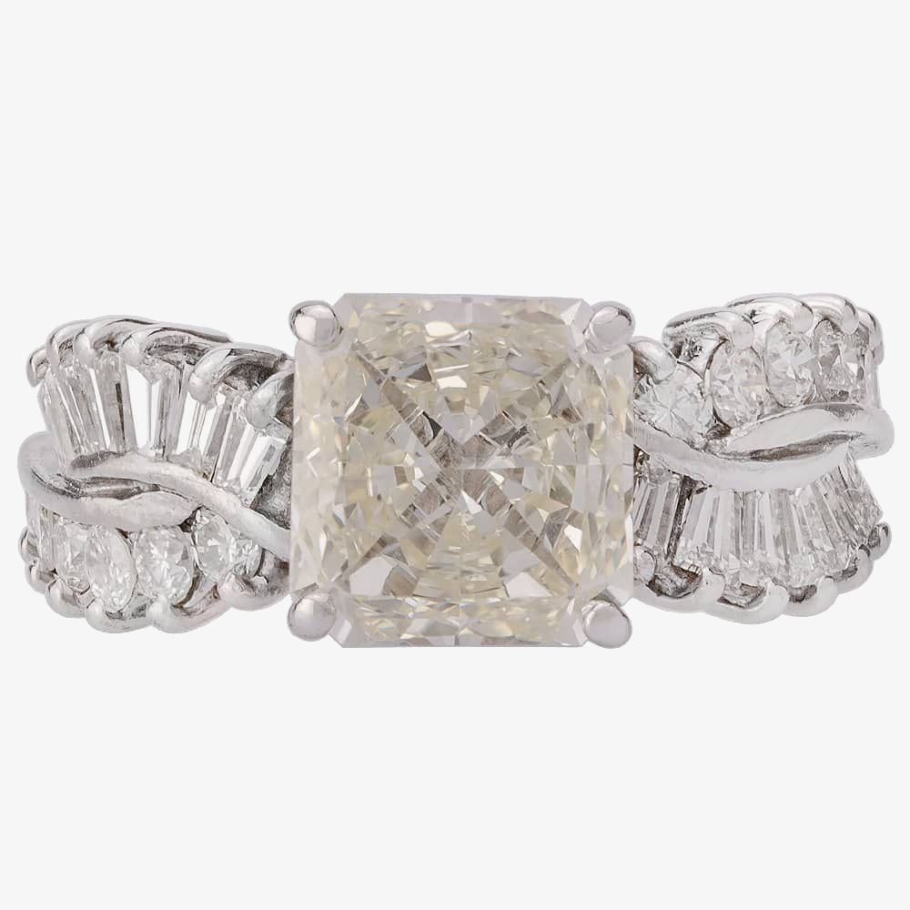 Diamond Carat: 2.10-2.25ct Radiant + 0.40ct tapered baguettes totalling 2.65ct