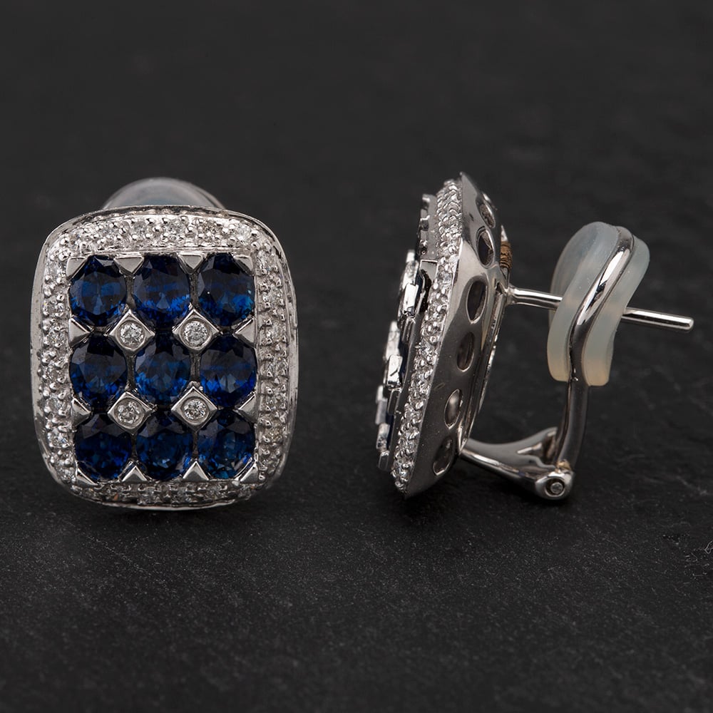 18ct White Gold Oval Nine Stone Sapphire Stud Earrings Set With Brilliant Cut Diamonds.
