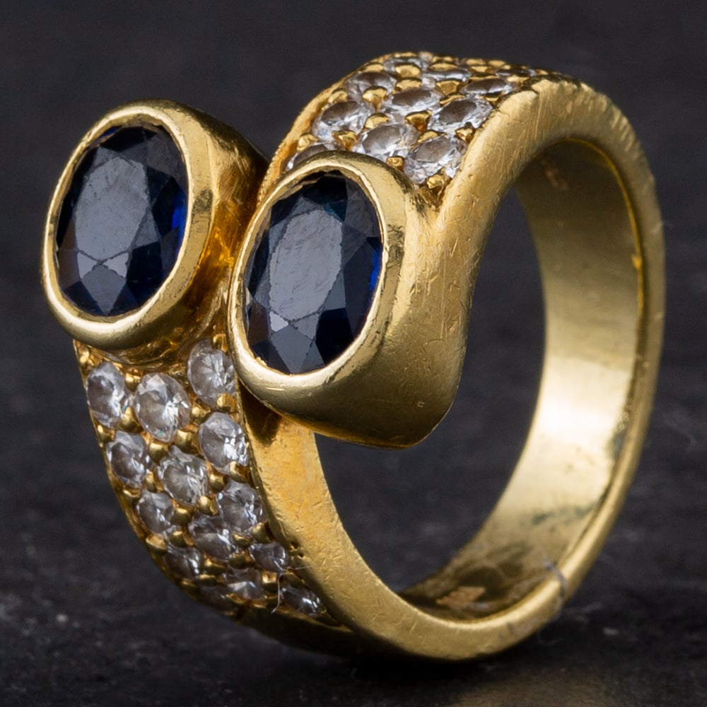 18ct Yellow Gold 2.40ct Sapphire & 0.86ct Brilliant Cut Diamond 3 Row Cross Over Ring