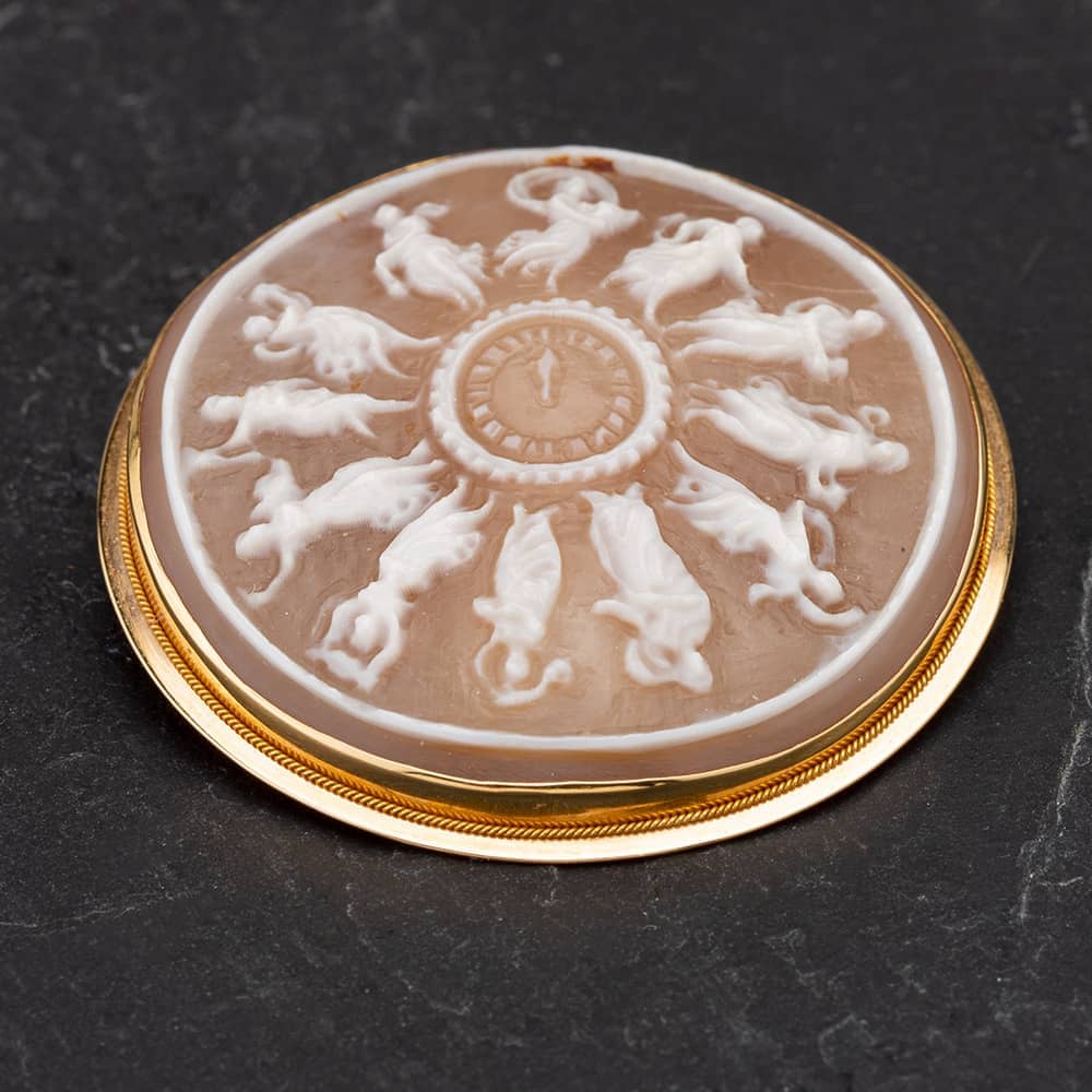 18ct Yellow Gold Large Round Dancing Graces Cameo Brooch With Fold Away Loop So Can Be Worn As Pendant Brooch Clasp Is Traditional Pin Bar With Lock Clip
