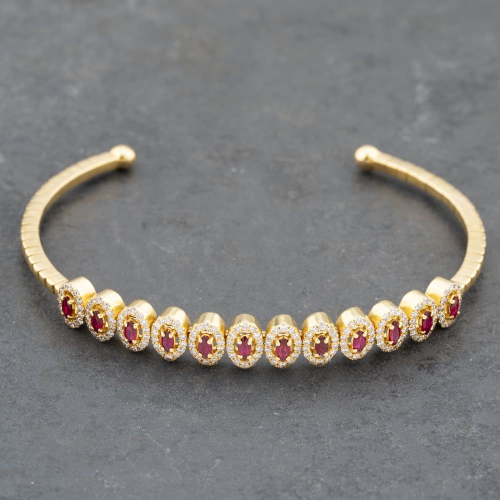 18ct Yellow Gold Ruby & 0.90ct Diamond Flexible Multi Cluster Medium Torque Bangle