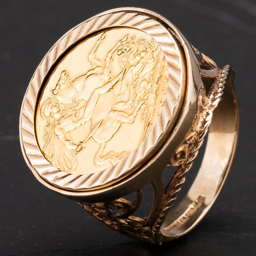 1925 King George Full Sovereign Coin In Fancy 9ct Yellow Gold Ring Mount with Open Work Fancy Shoulders