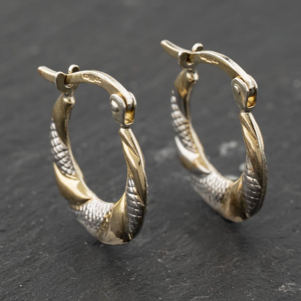 9ct Two Colour Gold 17mm Patterned Creole Earrings