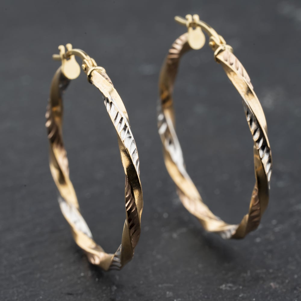 9ct Two Colour Gold 31mm Patterned Twist Hoop Earrings