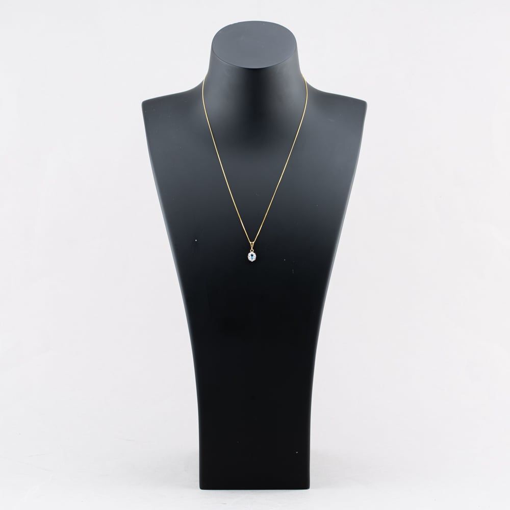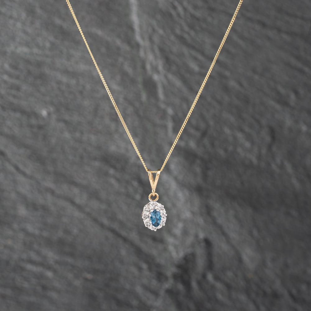 Second Hand 9ct Two Colour Gold Blue Topaz & 0.04ct Diamond Oval Cluster Pendant & 18 Inch Curb Chain 41142863 Second Hand 9ct Two Colour Gold Blue Topaz & 0.04ct Diamond Oval Cluster Pendant & 18 Inch Curb Chain 41142863