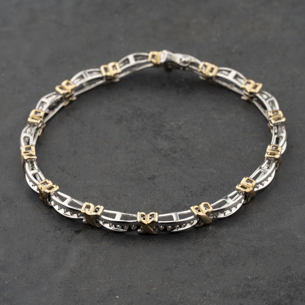 <a href="https://www.thbaker.co.uk/stores/"><b>Click here to find your <font color="6d1a42">nearest store</font></b></a>Second Handhttps://www.thbaker.co.uk/media/catalog/product/4/1/41-28-1797_model_1.jpgadd-to-cartcondition:Yesdisc_no_stock:NoYesNoSecond Hand4128179741281797LadiesT H Baker Packaging12 Month WarrantyNoBracelet12.8g7.25inch9ct Two Colour GoldTwo ColourDiamondWhiteBrilliant{"name":"v12_finance","text":"Or from \u00a330 per month","imageUrl":"https:\/\/www.thbaker.co.uk\/media\/nosto\/v12-finance.png"}Second Hand 9ct Two Colour Gold Brilliant Cut Diamond Bar And Cross 7.25 Inch Bracelet41-28-17972025-12-27 00:00:00[{"path":"\/Jewellery\/Diamond Jewellery","url":"\/diamonds\/"},{"path":"\/Jewellery","url":"\/jewellery\/"},{"path":"\/Jewellery\/Diamond Jewellery\/Round Diamond Jewellery","url":"\/round-diamond\/"},{"path":"\/Jewellery\/Bracelets\/Diamond Bracelets","url":"\/diamond-bracelets\/"},{"path":"\/Jewellery\/Bracelets\/Gemstone Bracelets","url":"\/gemstone-bracelets\/"},{"path":"\/Jewellery\/Bracelets","url":"\/bracelets\/"},{"path":"\/Second Hand Collection","url":"\/second-hand\/"},{"path":"\/Second Hand Collection\/Second Hand Jewellery","url":"\/second-hand-jewellery\/"},{"path":"\/Second Hand Collection\/Second Hand Bracelets & Bangles","url":"\/second-hand-bracelets-and-bangles\/"},{"path":"\/Second Hand Collection\/Second Hand Ladies","url":"\/second-hand-ladies-collection\/"},{"path":"\/Second Hand Collection\/Second Hand Diamonds","url":"\/second-hand-diamond-jewellery\/"},{"path":"\/Jewellery\/Ladies Jewellery","url":"\/ladies-jewellery\/"},{"path":"\/Second Hand Collection\/Second Hand Bracelets & Bangles\/Second Hand Diamond Set Bracelet","url":"\/second-hand-diamond-set-bracelet\/"},{"path":"\/Free Gift Card - When you spend \u00a3500+","url":"\/free-gift-card\/"},{"path":"\/Spend over \u00a31000 and receive a \u00a3100 gift card","url":"\/gift-card-promotion\/"},{"path":"\/\u00a3150 Gold Gift Card (\u00a31000 - \u00a32000)","url":"\/150-gold-gift-card\/"},{"path":"\/Second Hand Collection\/Second Hand Jewellery\/Second Hand 9ct","url":"\/second-hand-9ct-jewellery\/"},{"path":"\/Second Hand Collection\/Second Hand Bracelets & Bangles\/Second Hand Ladies Bracelets","url":"\/second-hand-ladies-bracelets\/"},{"path":"\/Free Gift With Purchase Products","url":"\/free-gift-with-purchase-products\/"},{"path":"\/Jewellery\/Diamond Jewellery\/Diamond Bracelets","url":"\/diamond-bracelets-2\/"}]2025-12-27