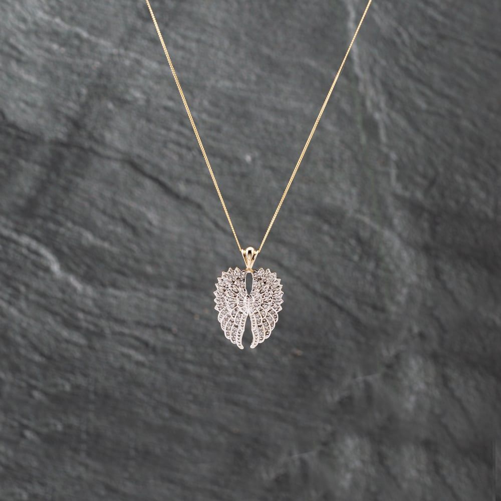 9ct Two Colour Gold Diamond Angel Wings Pendant & 18 Inch Curb Chain
