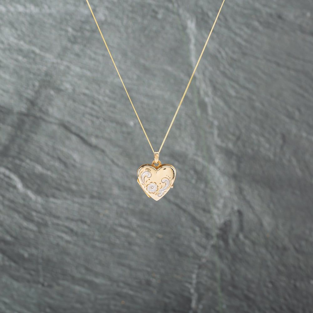 9ct Two Colour Gold Heart Flower Locket Pendant & 18 Inch Curb Chain